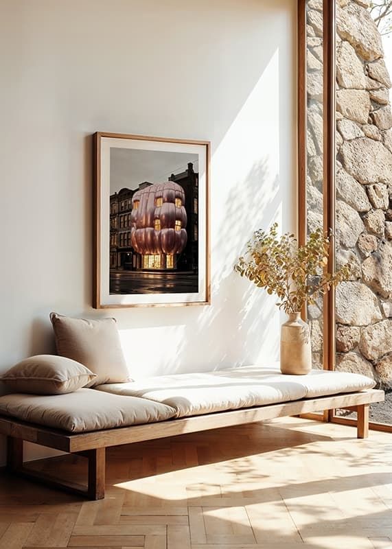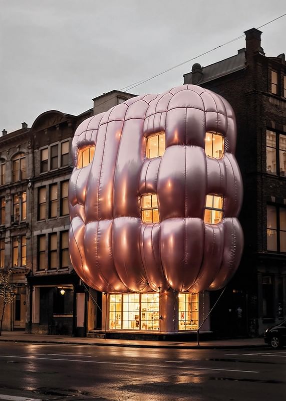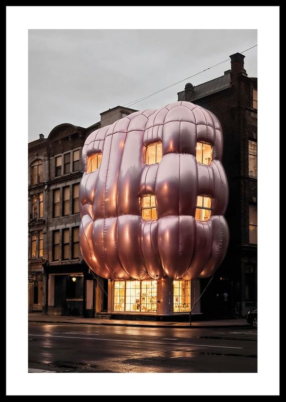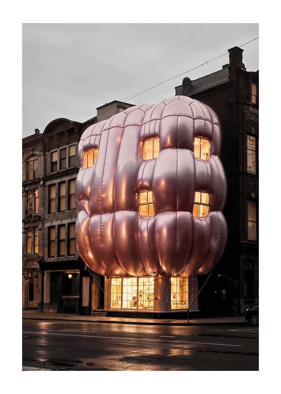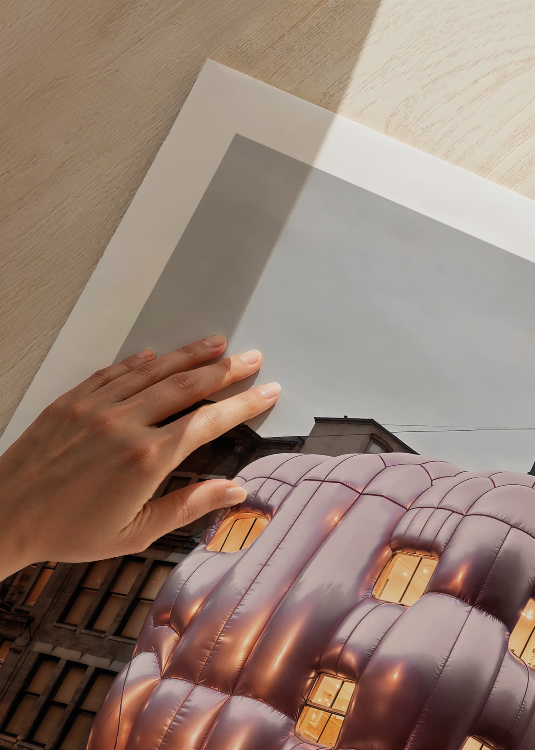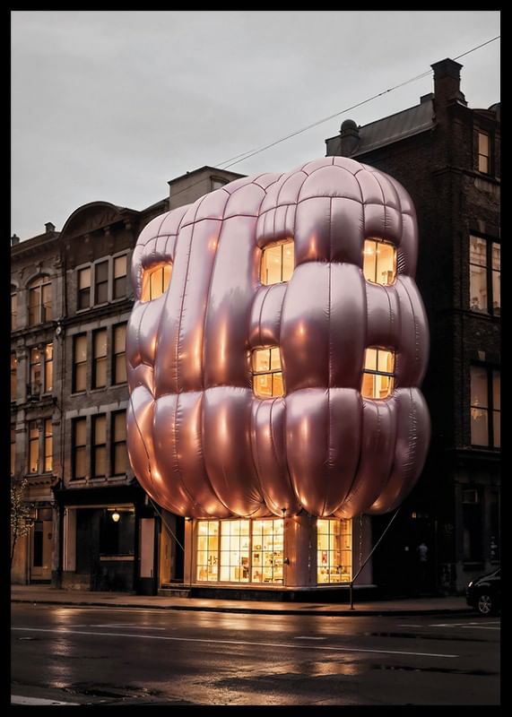 Uma impressionante fachada urbana revestida em material rosa brilhante domina o tema, onde o formato bulboso e inflado lembra um balão rosa e contrasta com os prédios mais antigos adjacentes. As janelas brilham convidativamente à luz do entardecer, criando uma expressão lúdica e moderna. Este pôster adiciona um toque criativo e contemporâneo à sua casa ou local de trabalho.