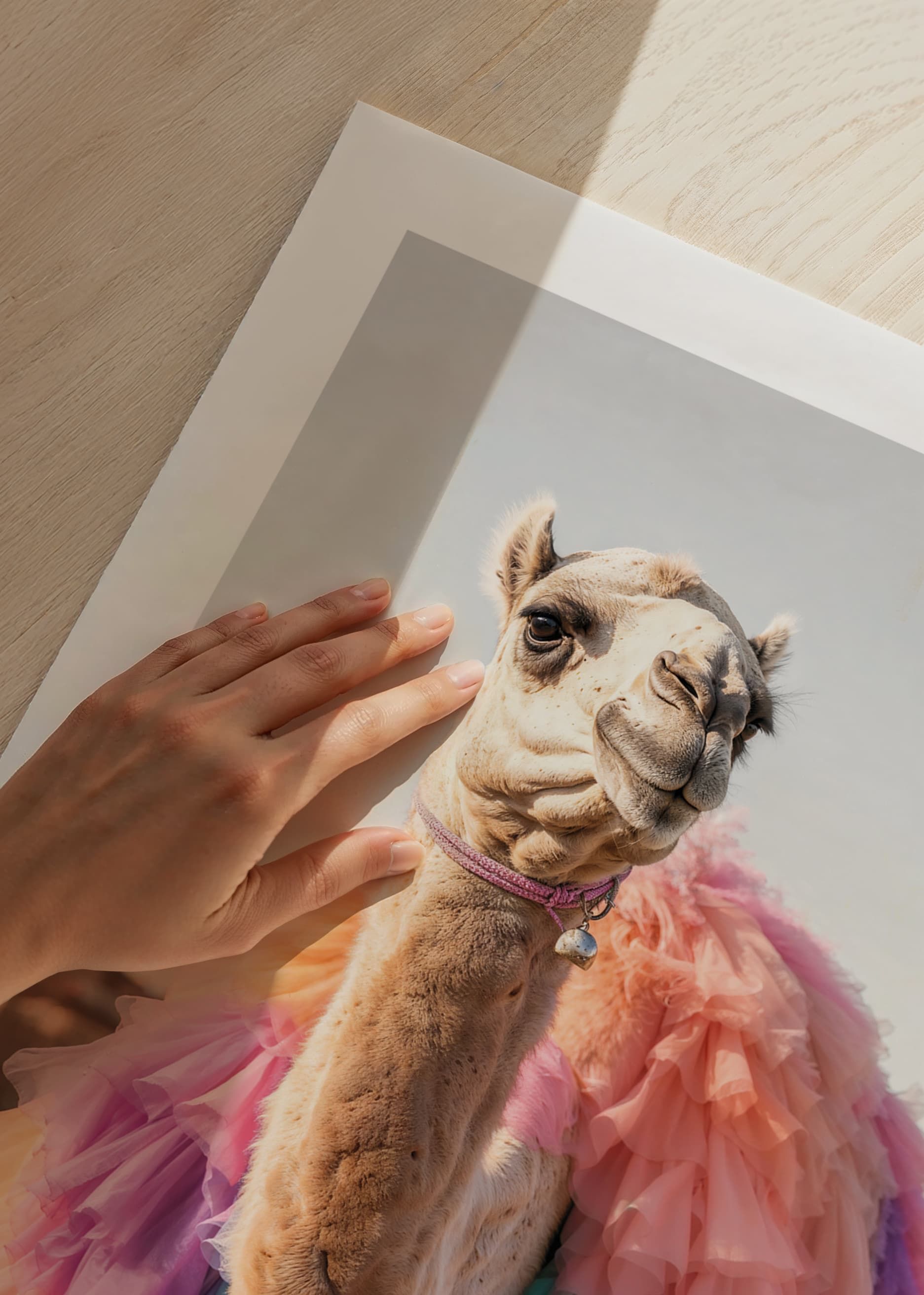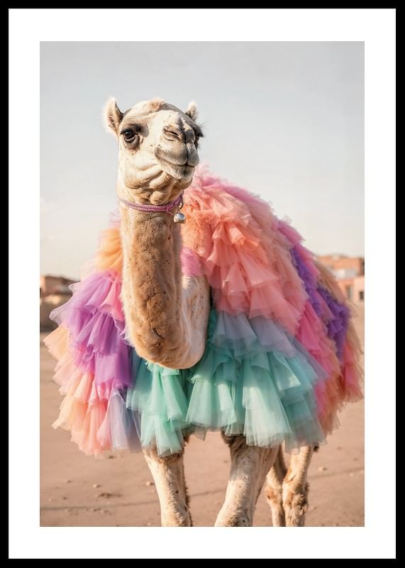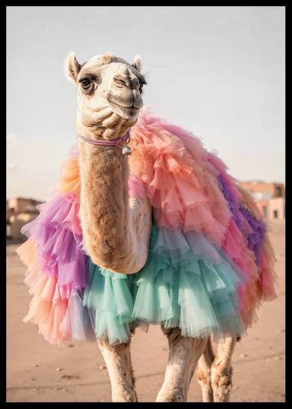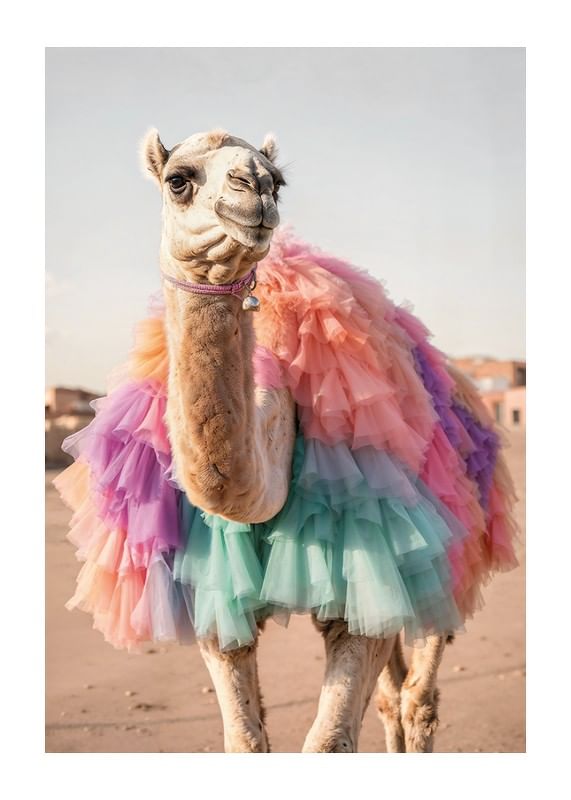 Um camelo vestindo uma saia feita de camadas de tule pastel contrasta com um fundo claro e arenoso. Tons de rosa, roxo, turquesa e pêssego dominam a peça e criam um contraste lúdico com a paisagem desértica. Este pôster será uma adição inesperada e charmosa a uma sala de estar ou quarto infantil, por exemplo.
