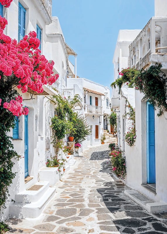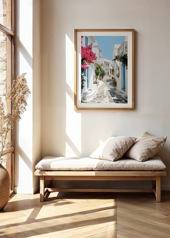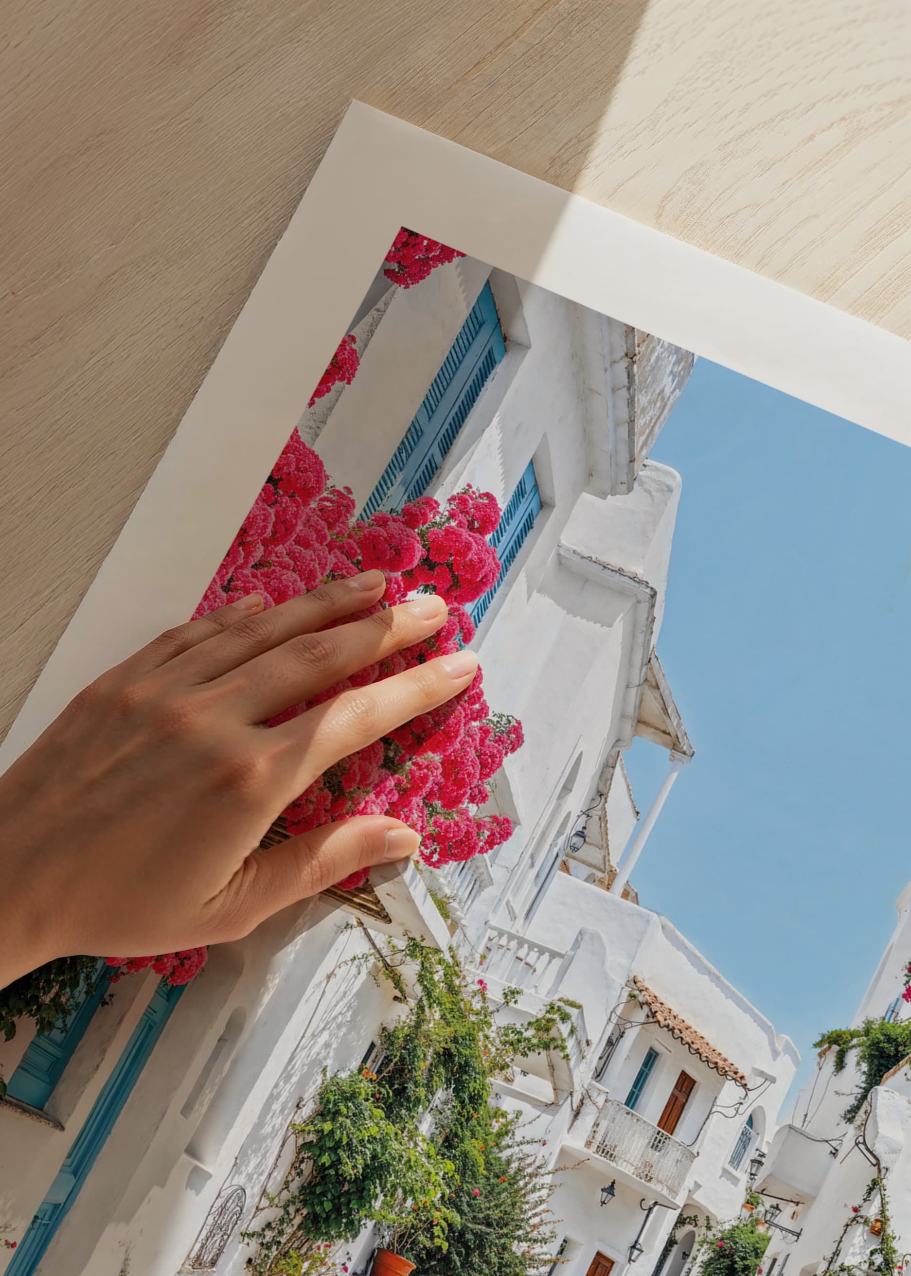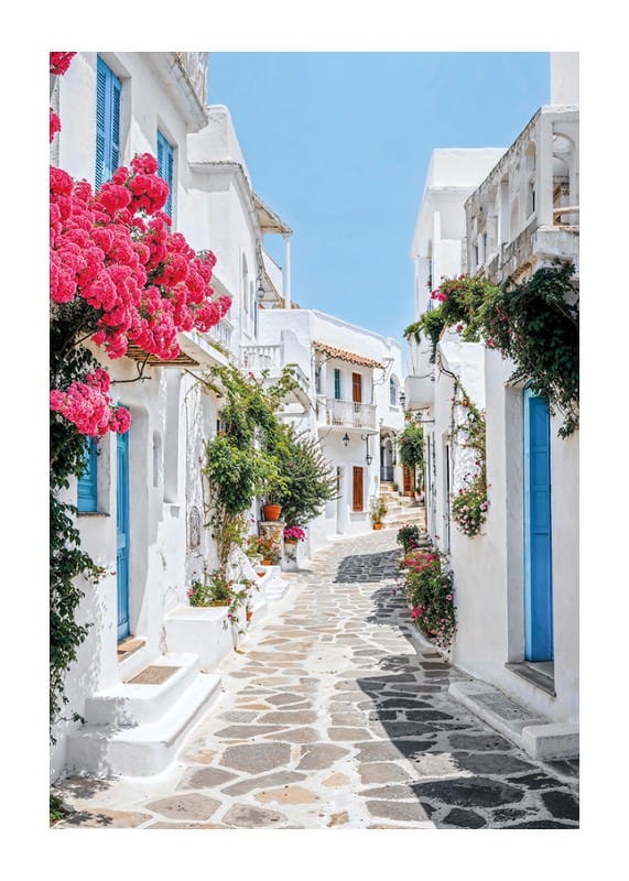 Becos estreitos e caiados são adornados com portas e venezianas azuis, enquanto buganvílias rosa-vivas sobem pelas fachadas. A superfície de pedra desbotada pelo sol conduz o olhar para a frente sob o céu azul claro. O pôster contribui com um toque mediterrâneo e combina perfeitamente com ambientes sociais ou iluminados.