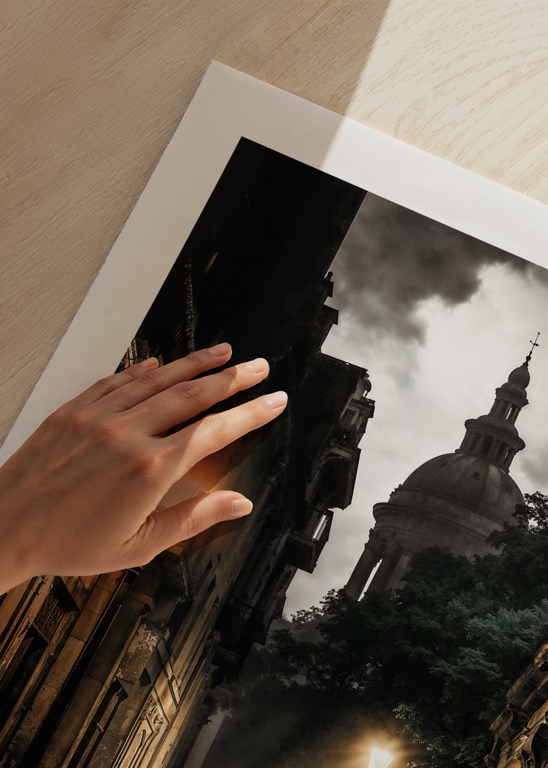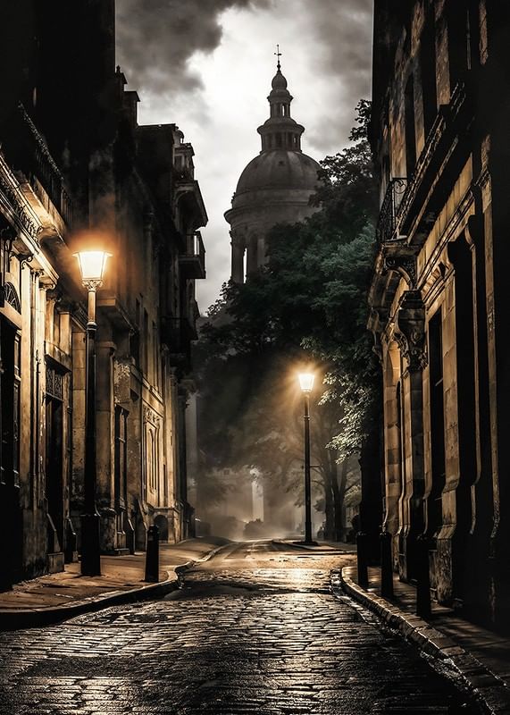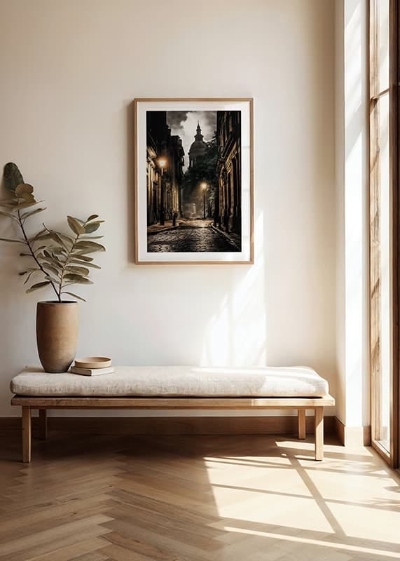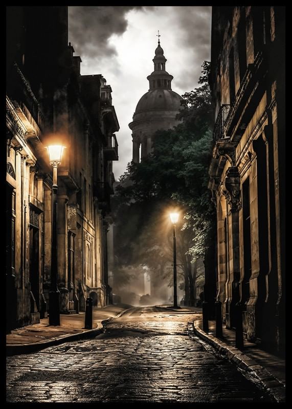 Postes de luz iluminam uma rua estreita de paralelepípedos, cercada por edifícios antigos de pedra, à luz do entardecer. Ao fundo, uma grande cúpula é visível e o céu está repleto de nuvens. Sombras suaves e reflexos de luz quente conferem ao tema um toque atemporal, tornando este pôster um elemento expressivo em uma sala de estar ou escritório.