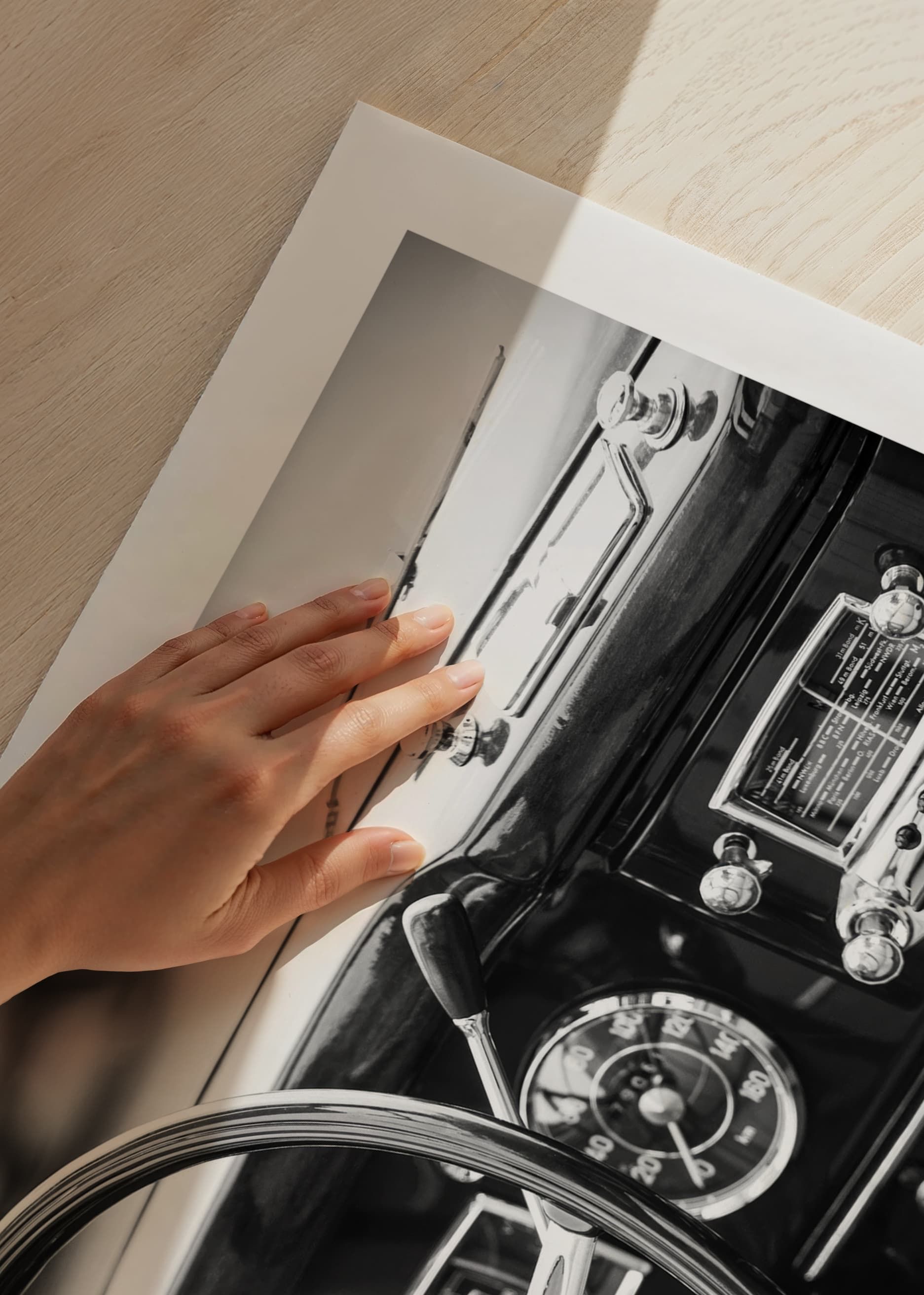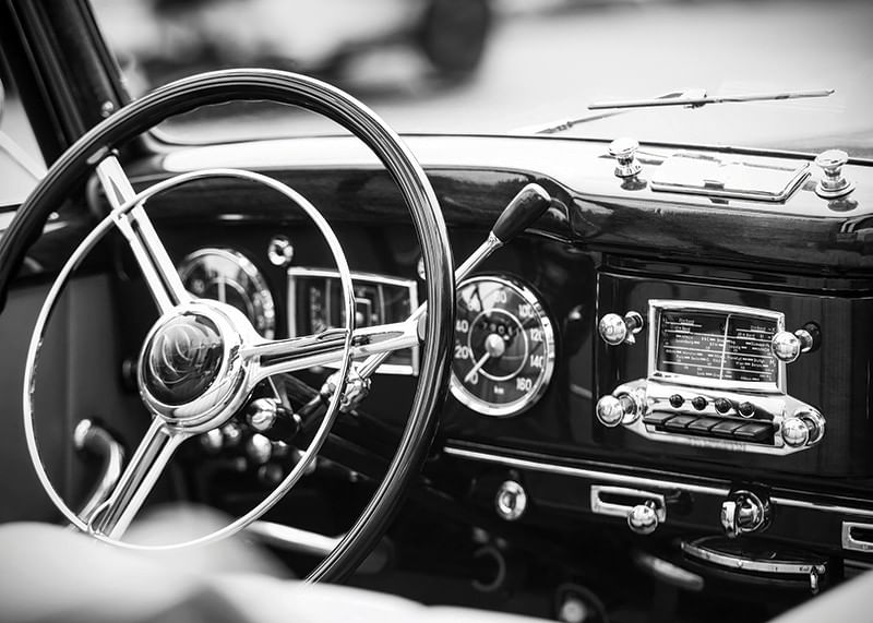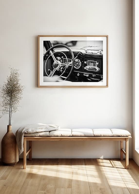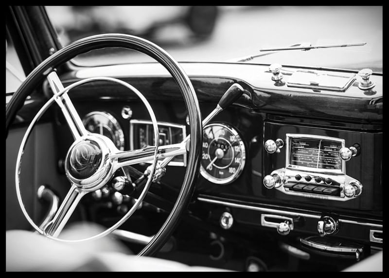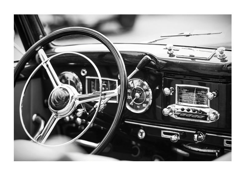 Pôster em preto e branco com uma fotografia que dá uma ideia de uma época passada com foco no volante brilhante e no painel bem preservado de um carro clássico. Os detalhes do design e o acabamento polido personificam o artesanato e o luxo de uma época passada.