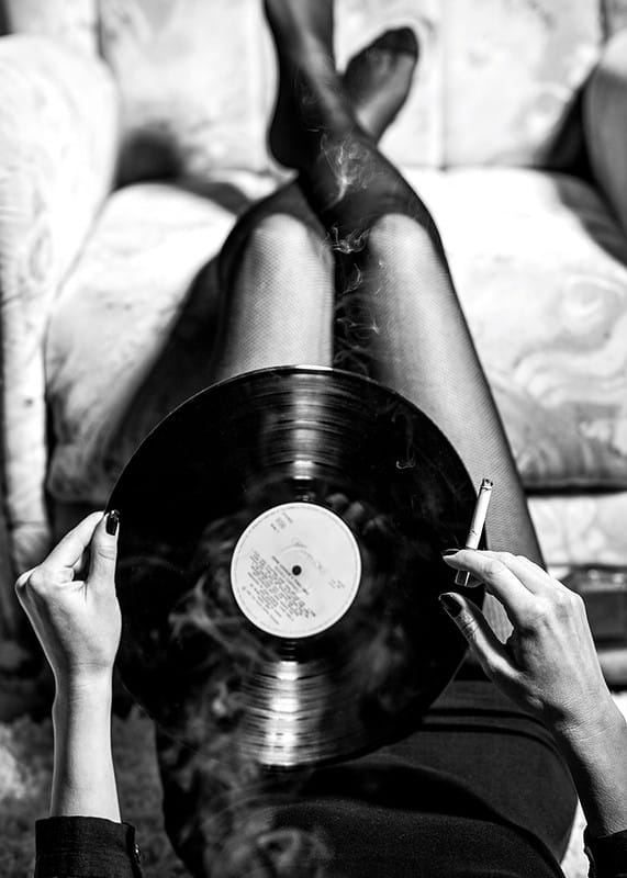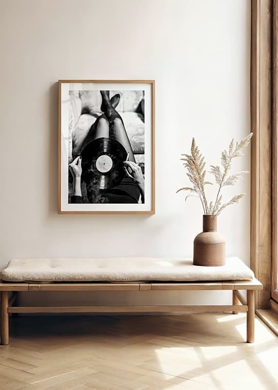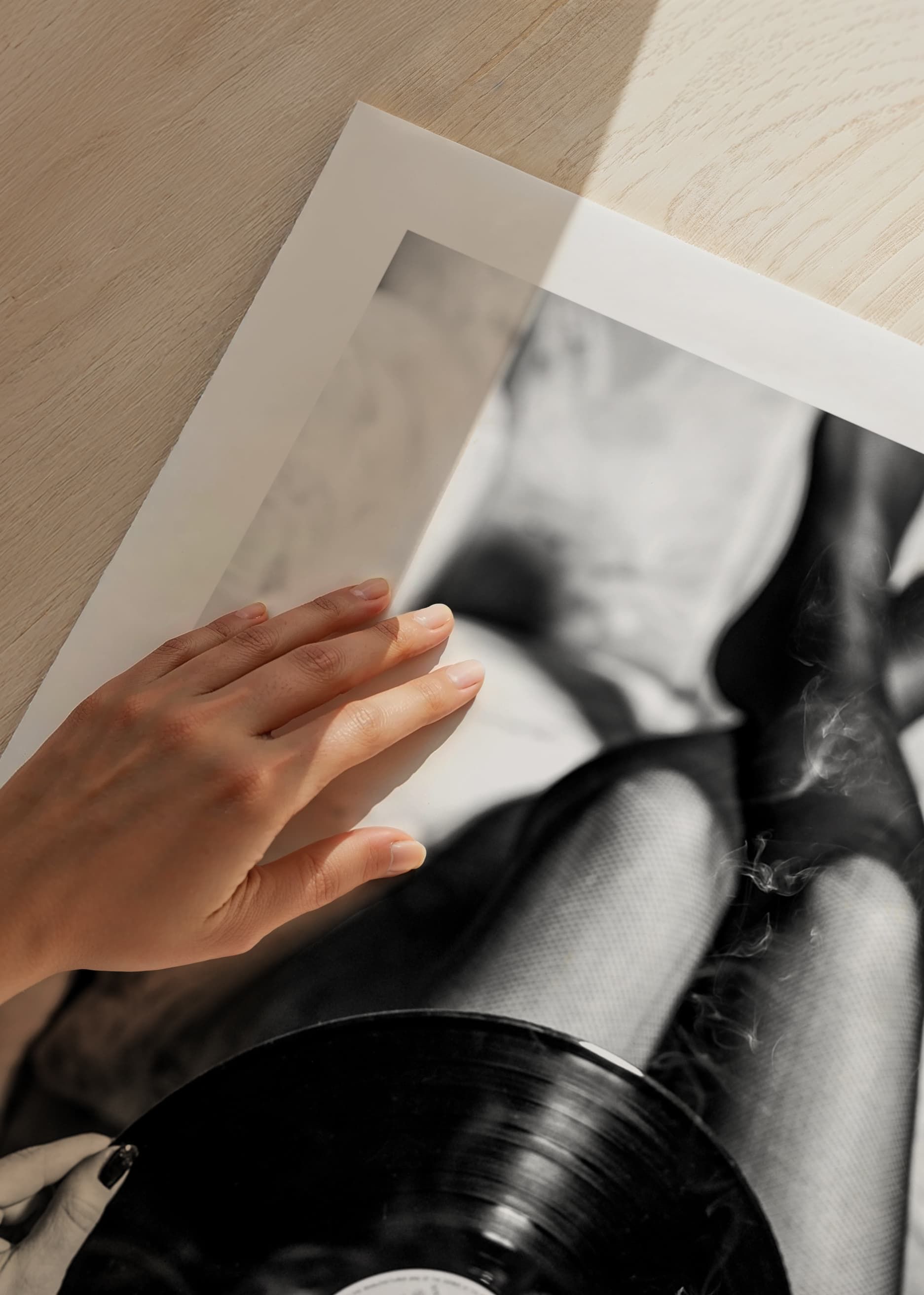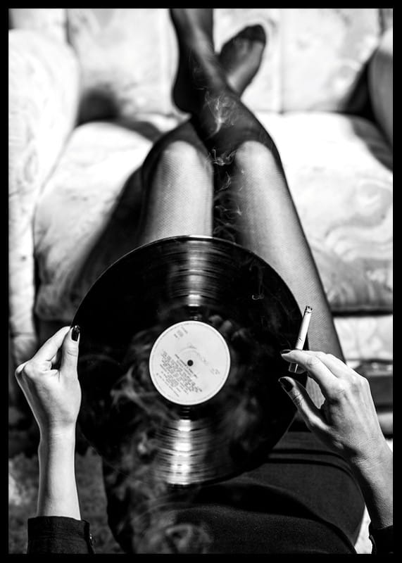 Poster da categoria arte fotográfica com uma fotografia vintage em preto e branco de uma mulher segurando um disco de vinil.
