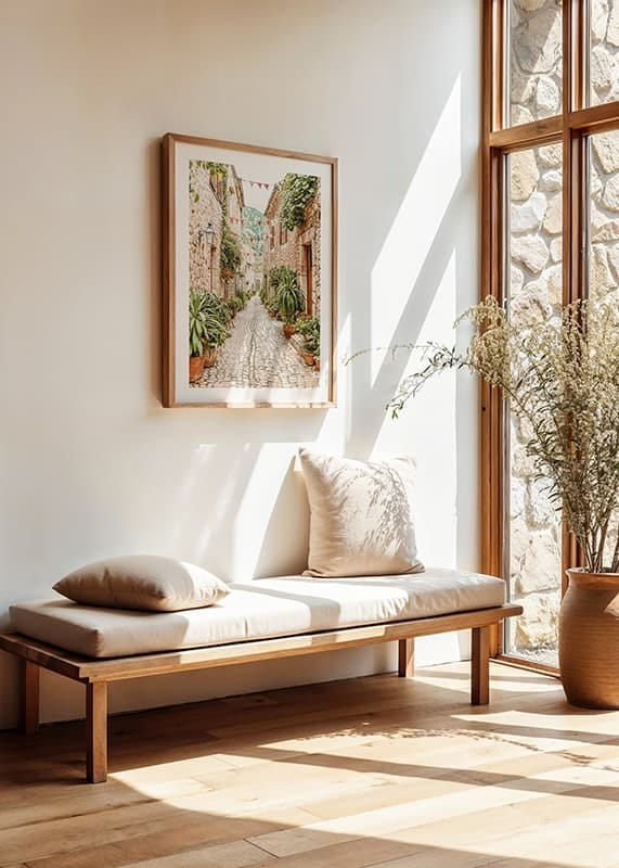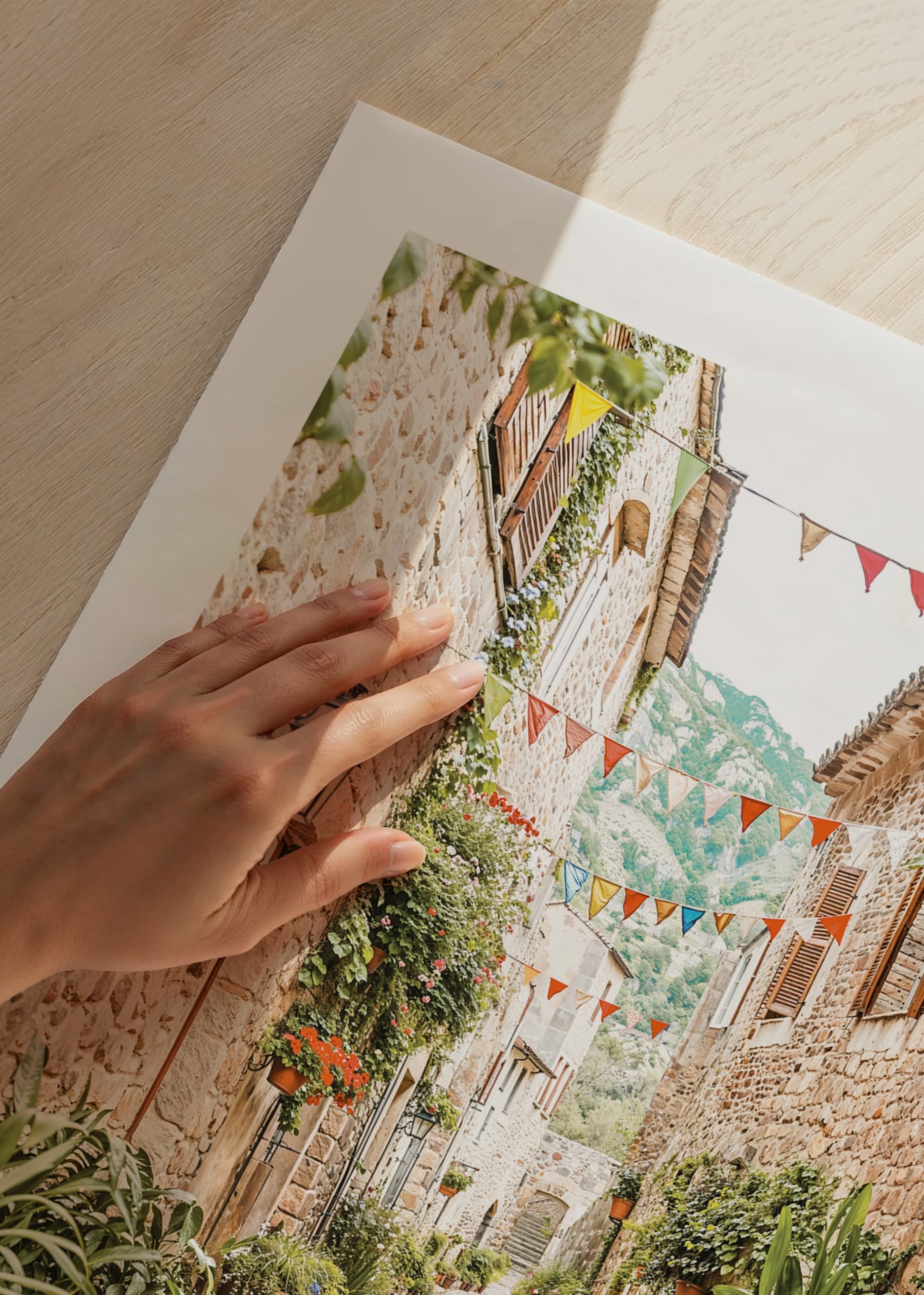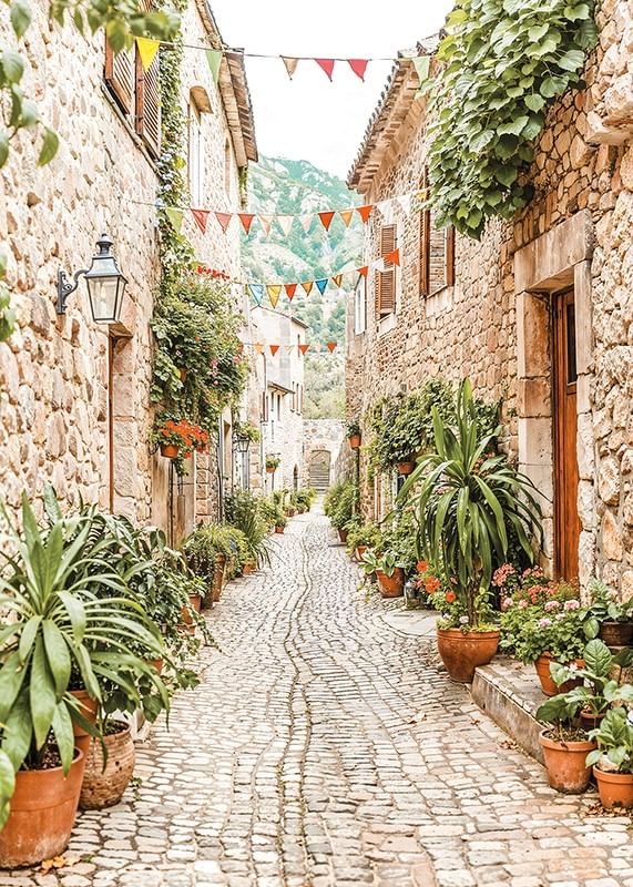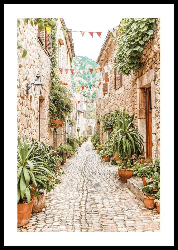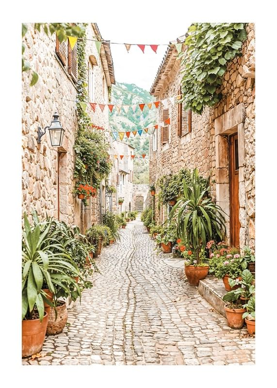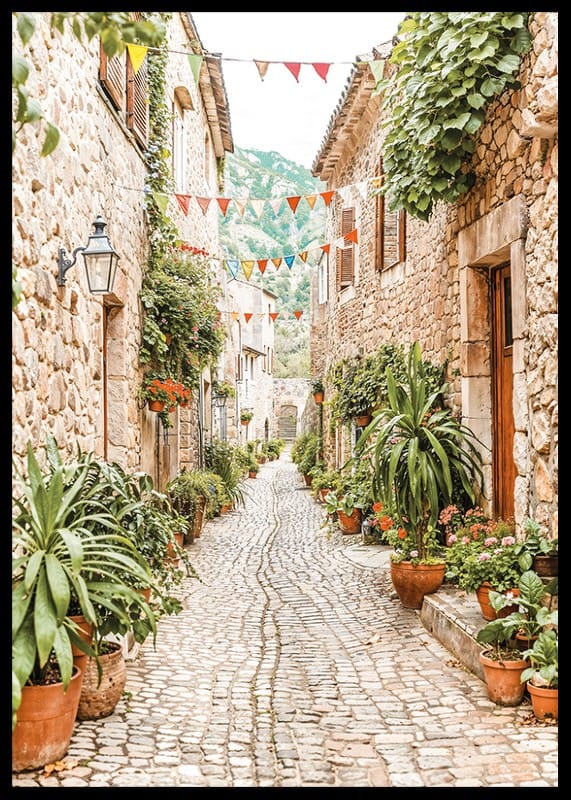 Este cartaz capta o encanto de um beco pitoresco numa aldeia mediterrânica, onde ruas de paralelepípedos serpenteiam entre casas de pedra cobertas por uma vegetação luxuriante e flores coloridas. As flâmulas alinham-se no beco, criando uma atmosfera festiva e convidativa. Os tons quentes das rochas e a rica vegetação criam uma sensação de calma e intemporalidade, enquanto as montanhas ao fundo reforçam a localização idílica da aldeia. Este poster é perfeito para dar um toque de beleza rústica e um toque mediterrânico à sua casa.