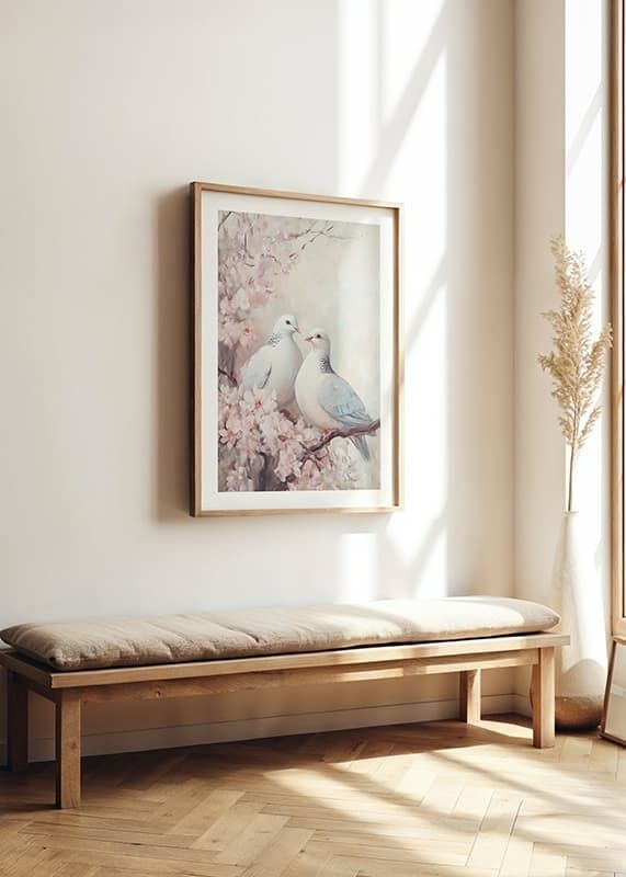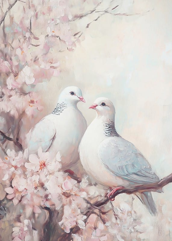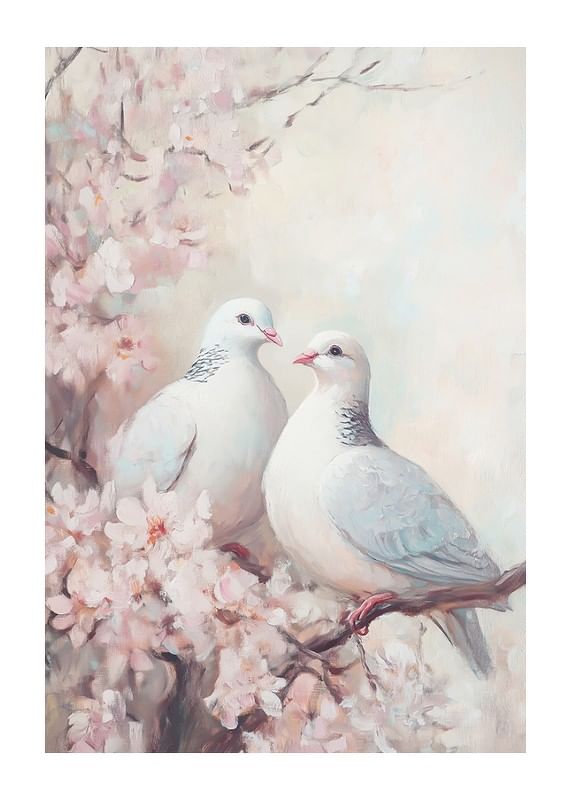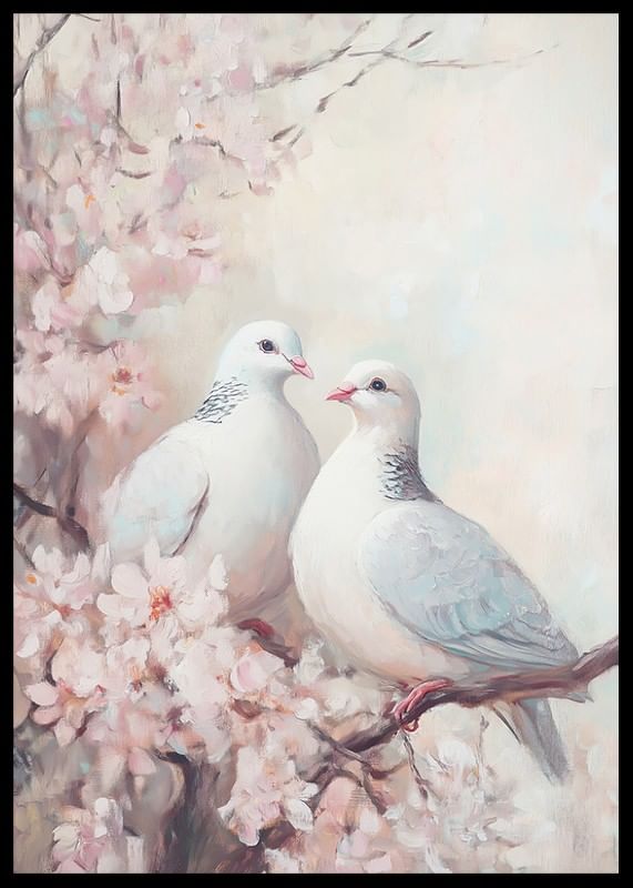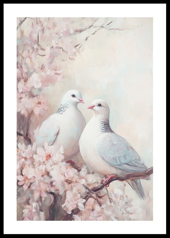 Encha a sua casa de tranquilidade e romance com este poster que representa duas pombas brancas num ramo de cerejeira em flor em tons pastel suaves. Com a sua expressão harmoniosa e simbolismo de paz e amor, a imagem cria uma atmosfera pacífica e bela. Perfeito para transmitir uma sensação de elegância e serenidade, este poster é uma homenagem à poesia da natureza e à beleza da primavera.