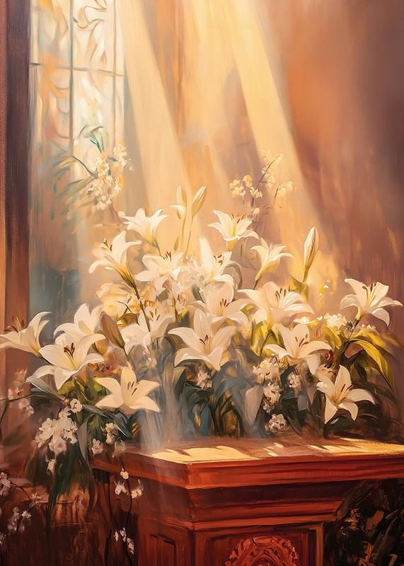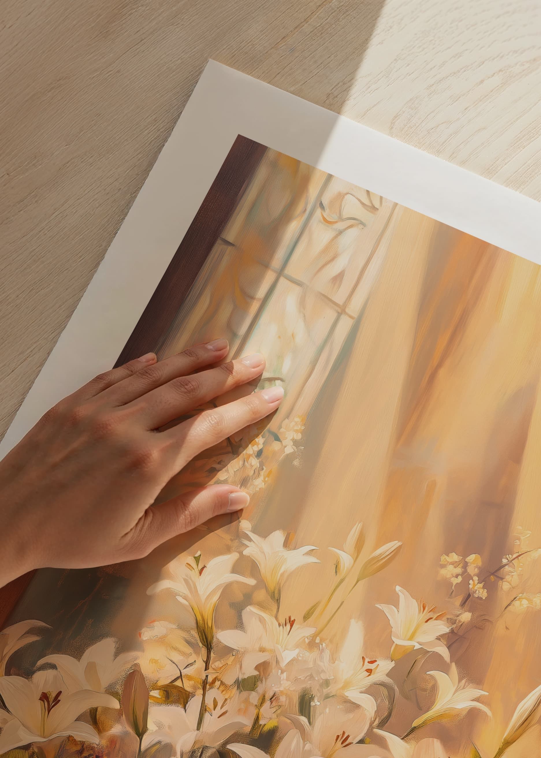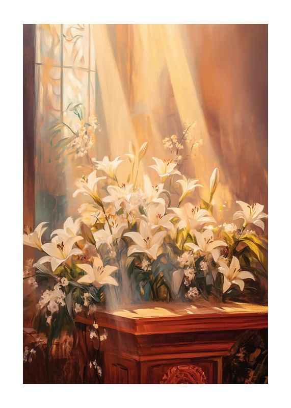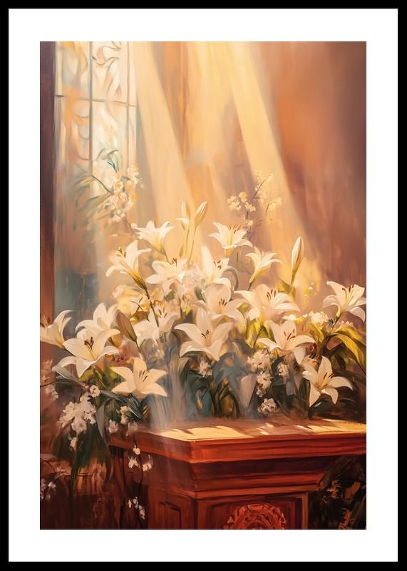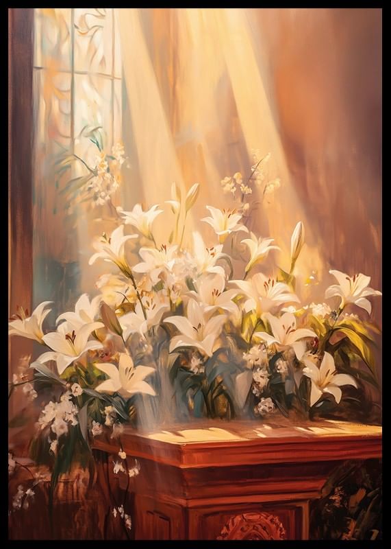 Capte uma sensação de paz e beleza com este poster que retrata uma magnífica coleção de lírios brancos banhados por raios de luz dourados provenientes de um vitral. Com a sua luz harmoniosa e as flores elegantes, a imagem cria uma atmosfera de tranquilidade e elegância intemporal. Perfeito para adicionar uma sensação de solenidade e beleza natural à sua casa, este poster é uma celebração do puro encanto do lírio.