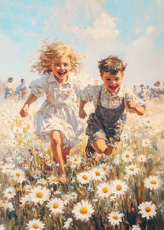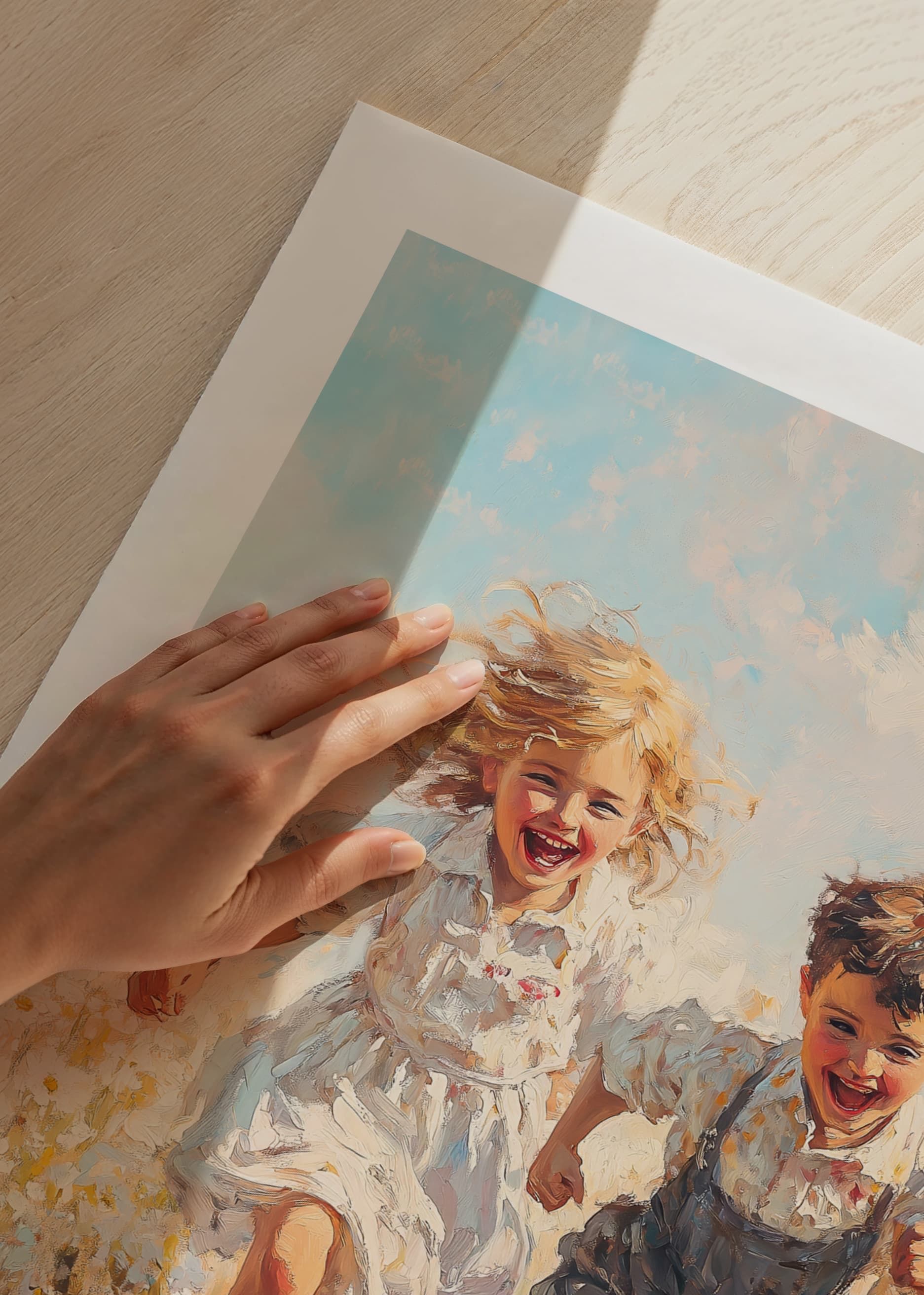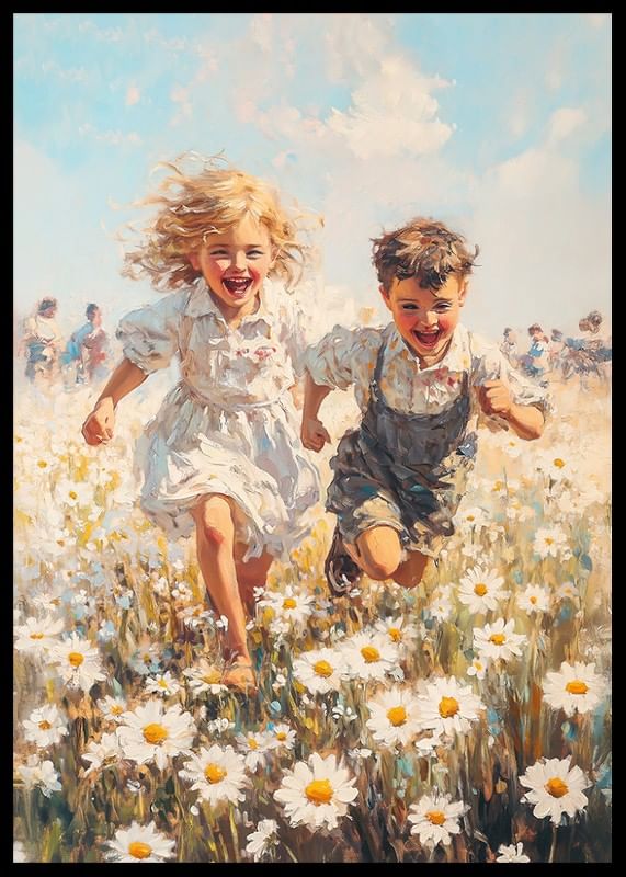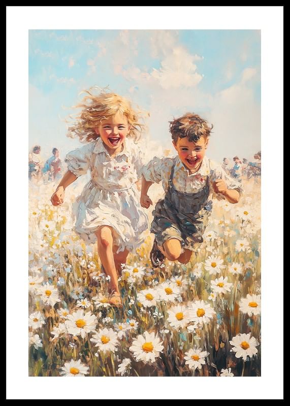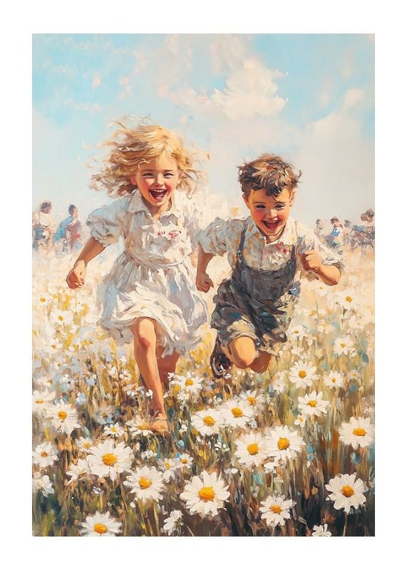 Capte a alegria da infância com este cartaz vibrante que mostra duas crianças a correr por um prado de margaridas sob um céu azul claro de verão. Com energia e calor, a imagem transmite uma sensação de liberdade, ludicidade e pura felicidade. Perfeito para iluminar a sua casa e recordar os momentos simples e bonitos da vida. Uma homenagem aos momentos mágicos da infância.