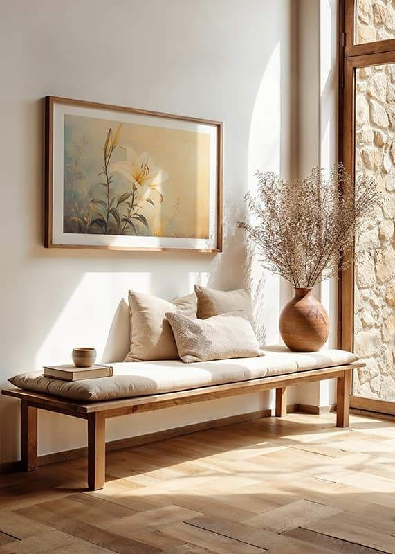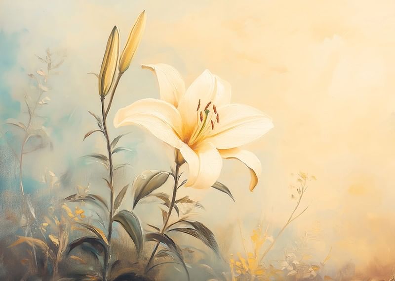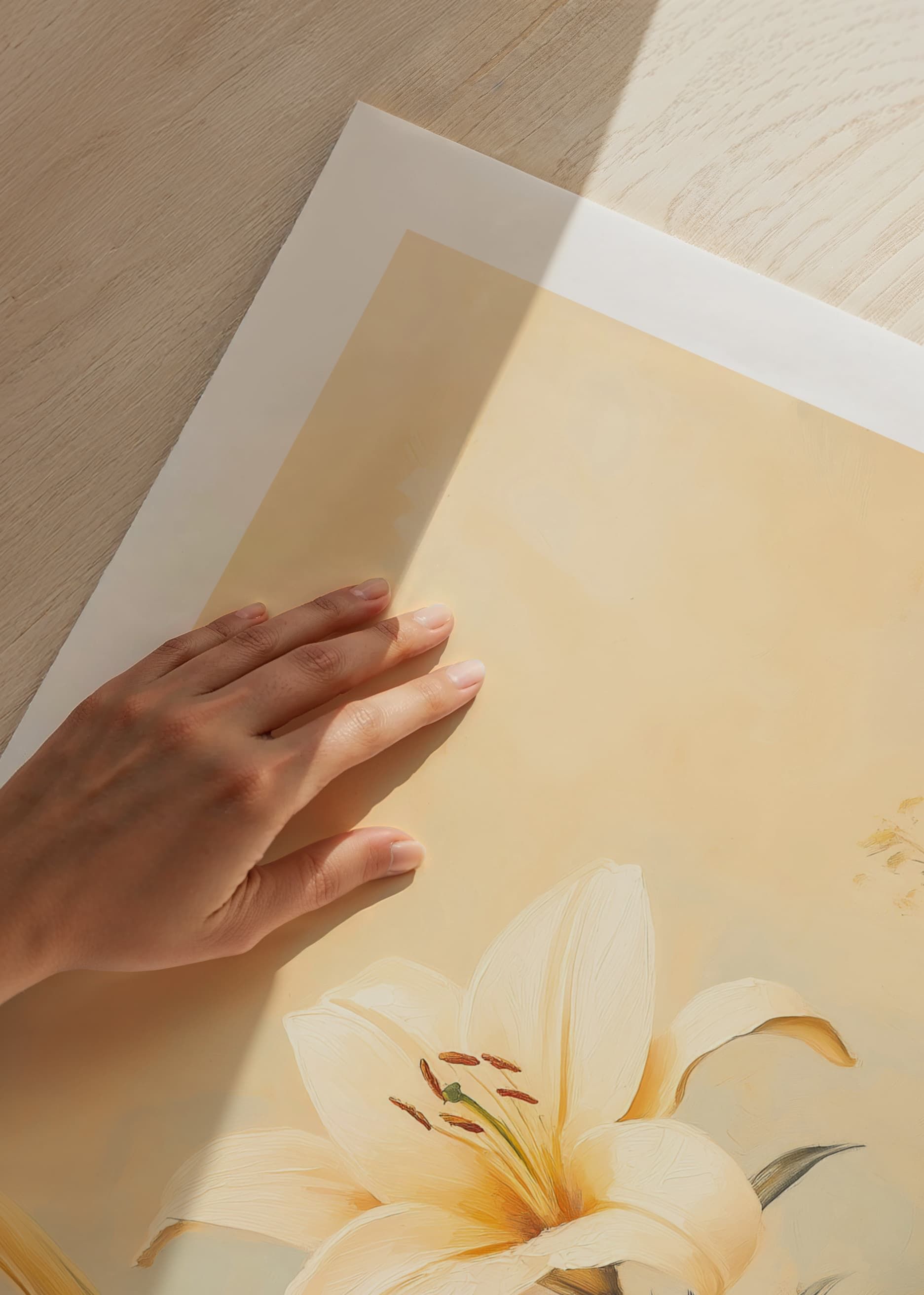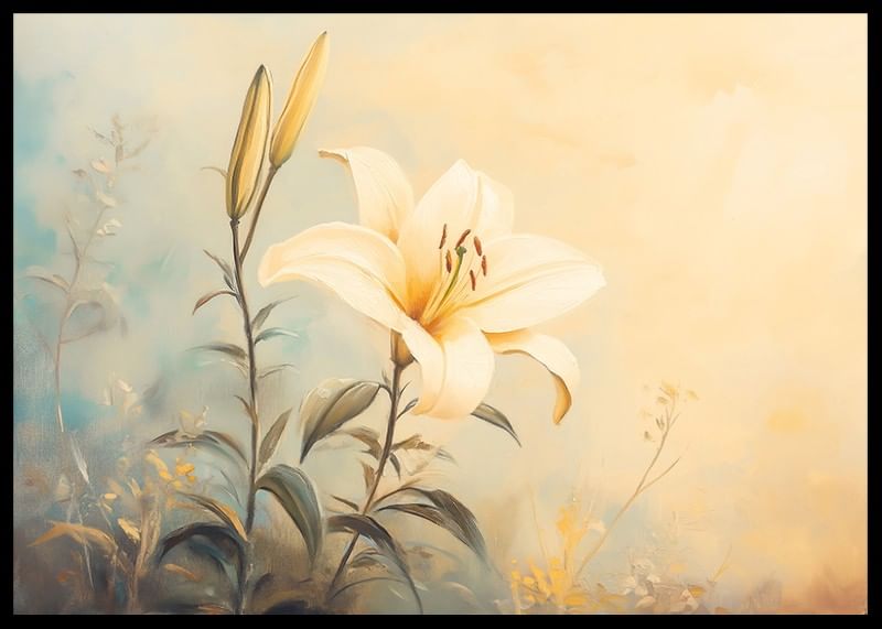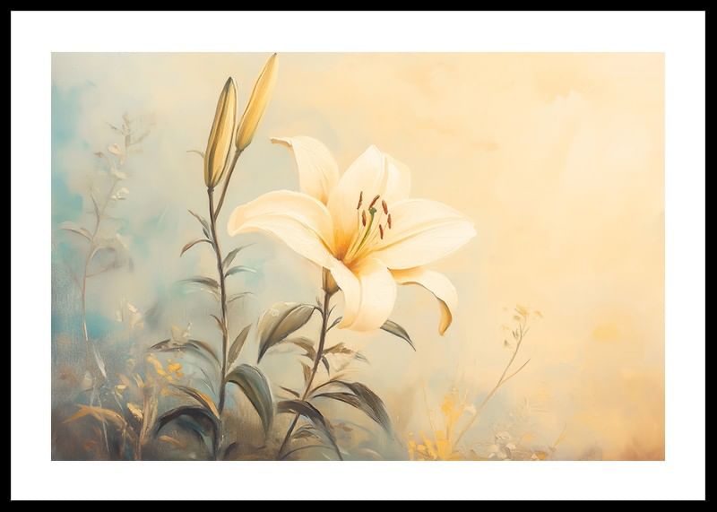 Ilumine a sua casa com este poster elegante que capta um lírio em plena floração, rodeado por folhas macias e uma luz dourada cintilante. Com a sua paleta de cores subtil e composição graciosa, a imagem exala harmonia e beleza intemporal. Perfeito para criar um ambiente calmo e sofisticado em sua casa - uma celebração da simplicidade e elegância da natureza.