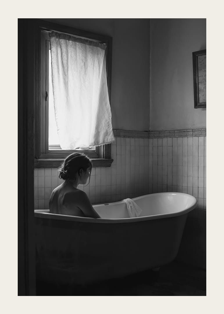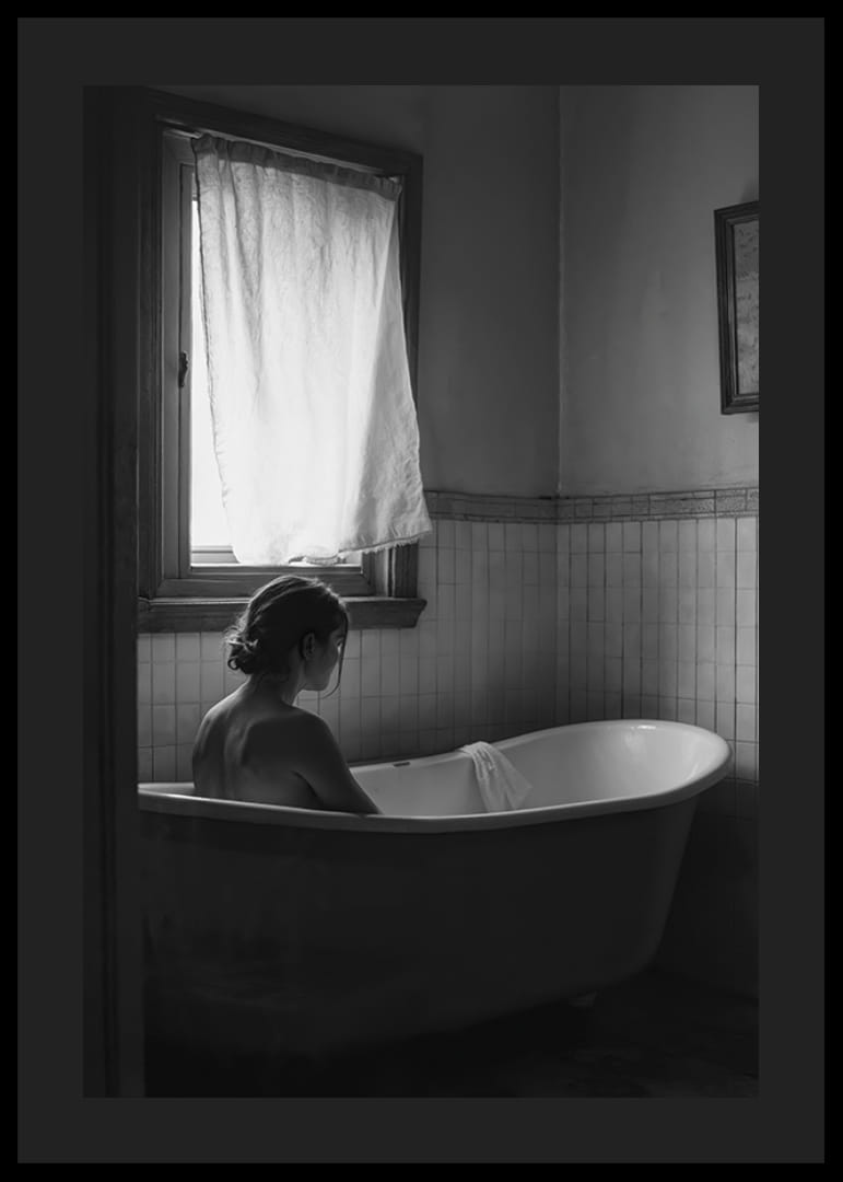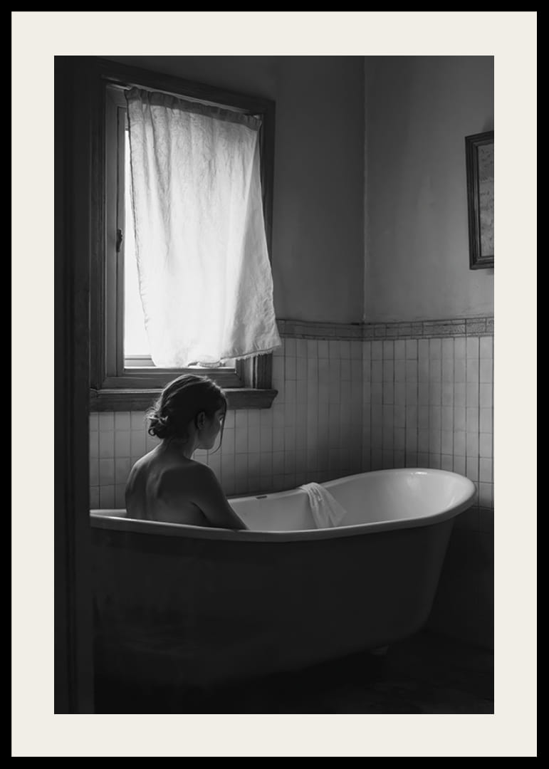 Este bonito póster capta um momento tranquilo de solidão e reflexão. Uma pessoa está sentada numa banheira antiga, rodeada pela suave luz do dia que entra por uma janela coberta. O ambiente discreto e despojado proporcionam uma sensação de calma e privacidade, perfeito para quem quer decorar a sua casa com uma sensação de calma e introspeção. Uma imagem que relembra a importância de encontrar a paz no dia-a-dia.