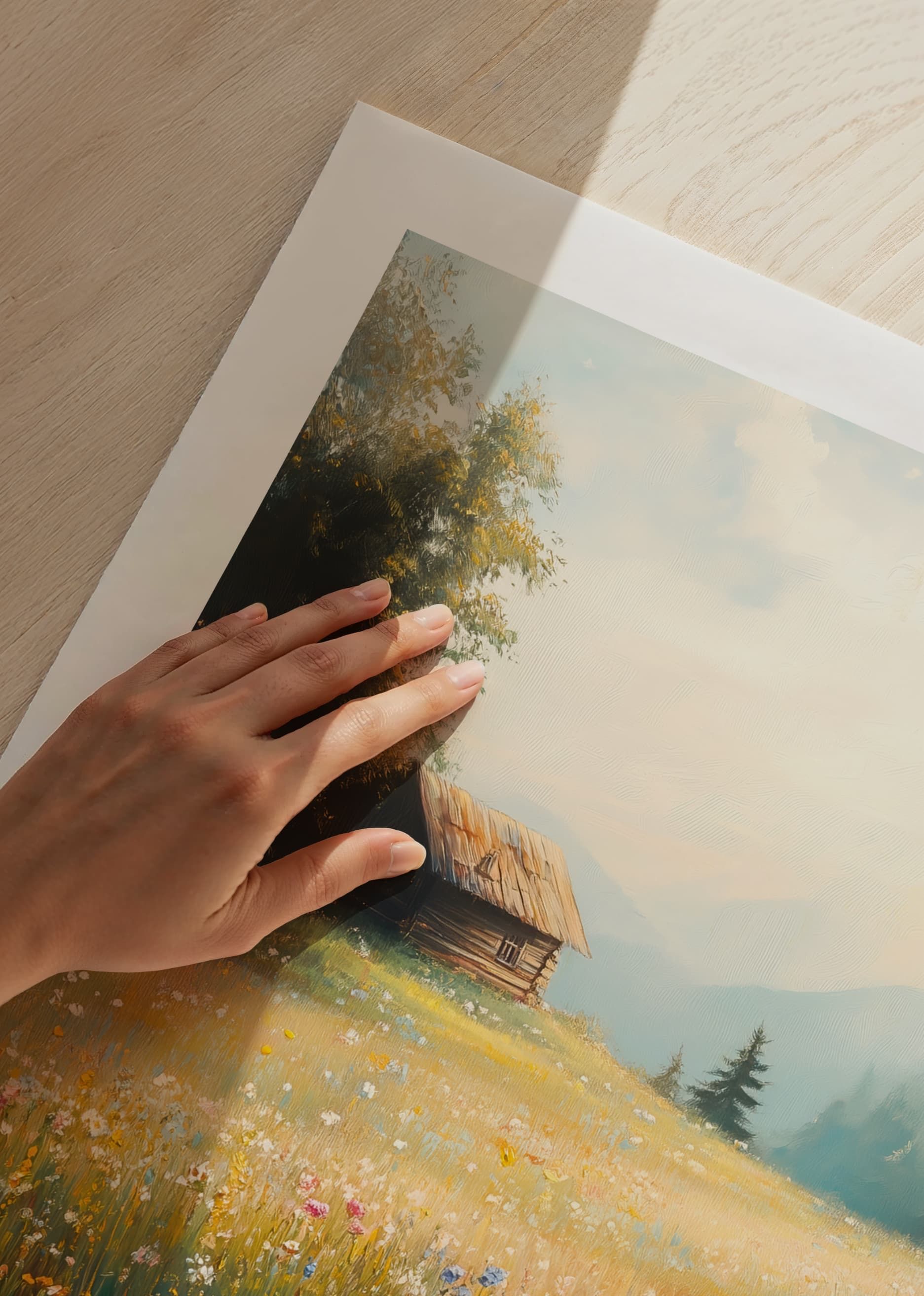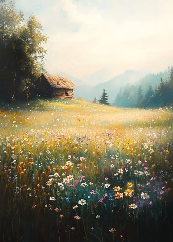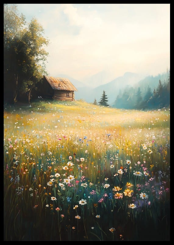 Este cartaz envolvente capta um prado florido idílico banhado pela luz dourada do sol, onde uma encantadora cabana de madeira repousa na orla da floresta. As flores coloridas e a luz suave criam uma sensação de calma, liberdade e nostalgia.