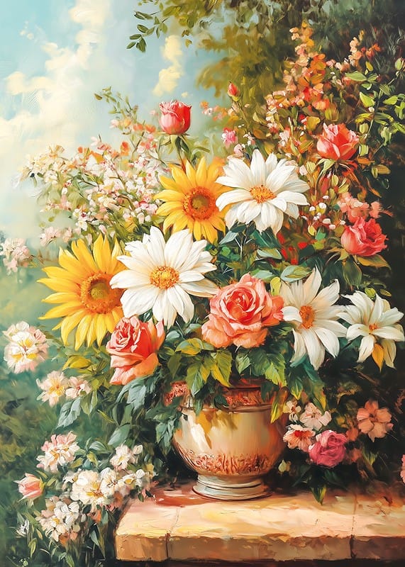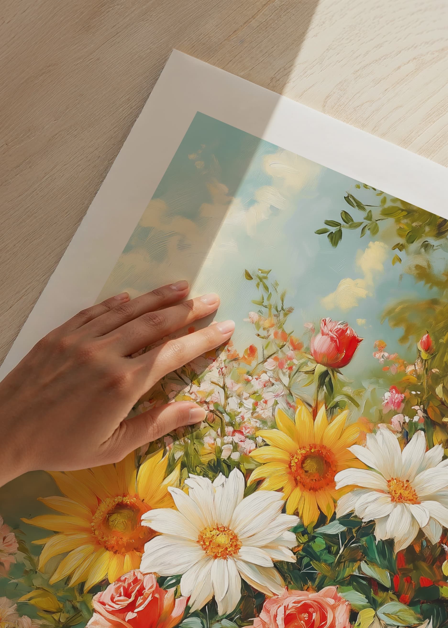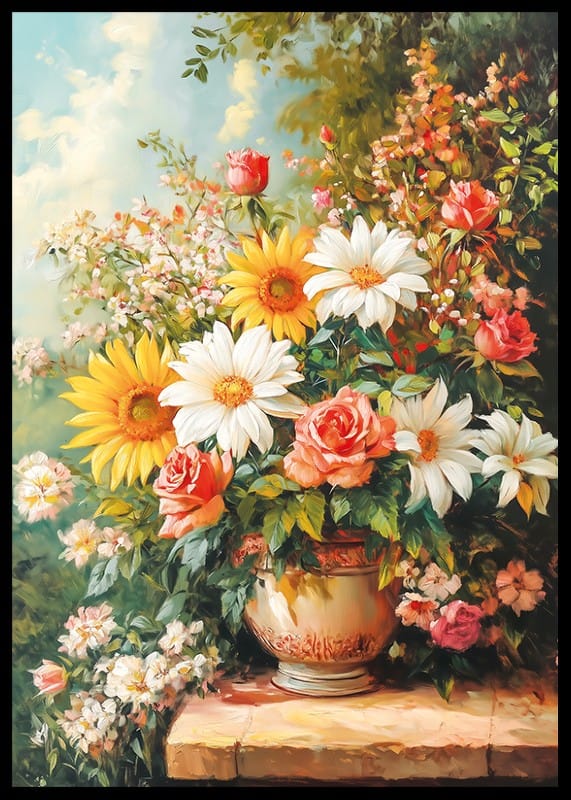 Este póster capta a beleza da natureza com um bouquet radiante de girassóis, rosas e flores vistosas em tons quentes e vibrantes. A luz dança sobre as folhas, criando uma sensação de alegria e harmonia.