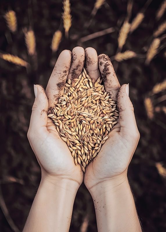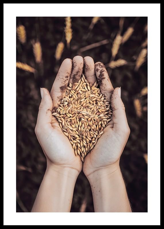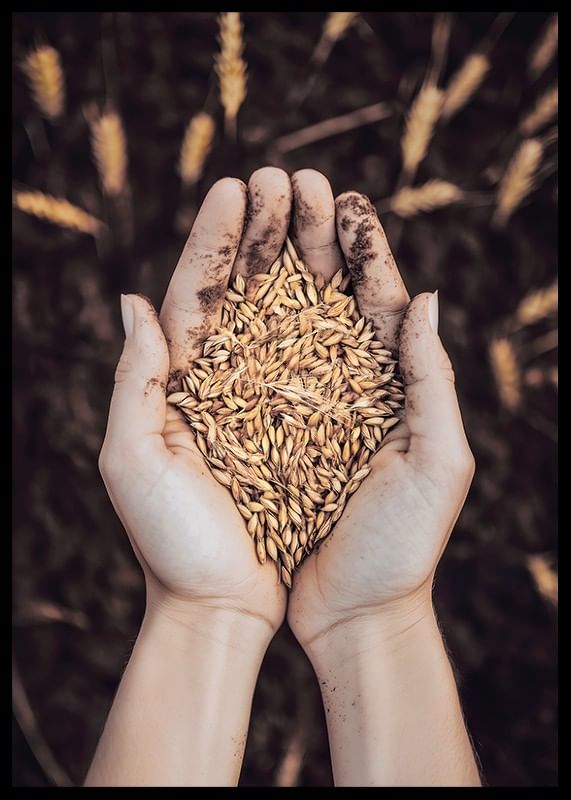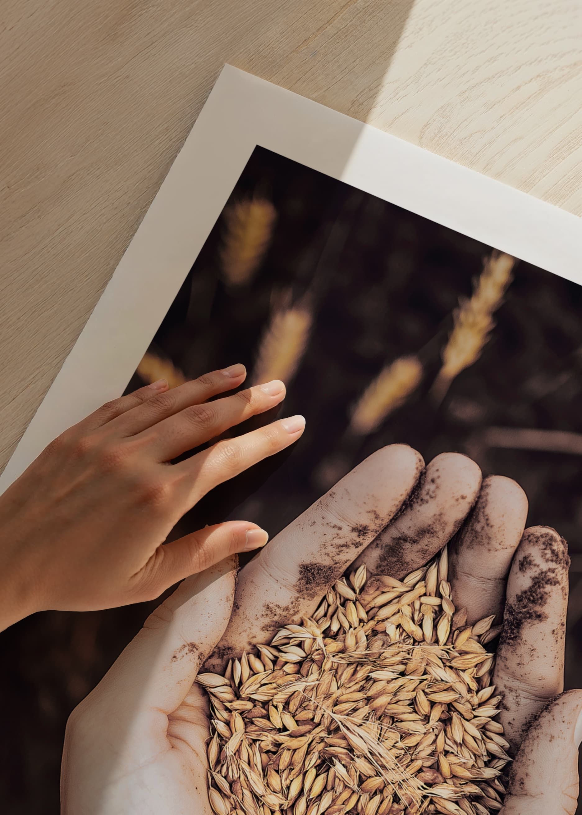 Capte a beleza dos ciclos da natureza com este póster em terra. A imagem mostra mãos repletas de grãos dourados, símbolos de colheita, vida e nutrição. As mãos sujas falam da alegria do trabalho e da ligação à terra, um lembrete de que tudo o que é grande começa a partir de uma pequena semente. Perfeito para criar um ambiente acolhedor e rústico em sua casa e celebrar a riqueza e durabilidade da natureza.