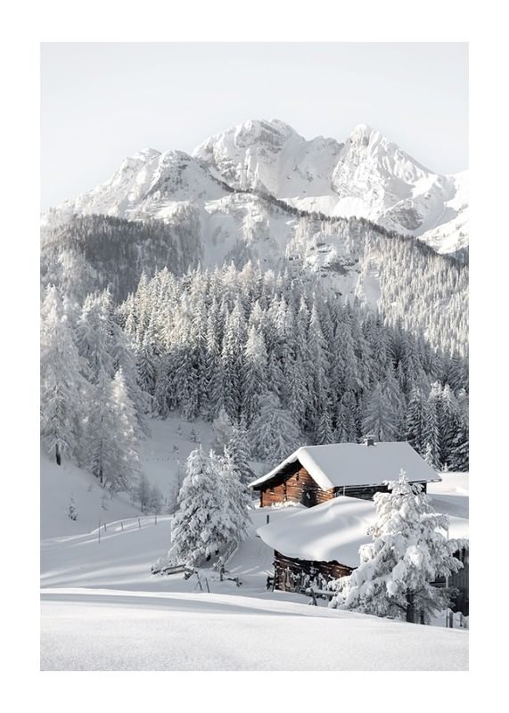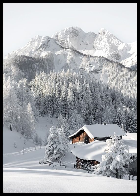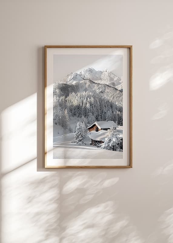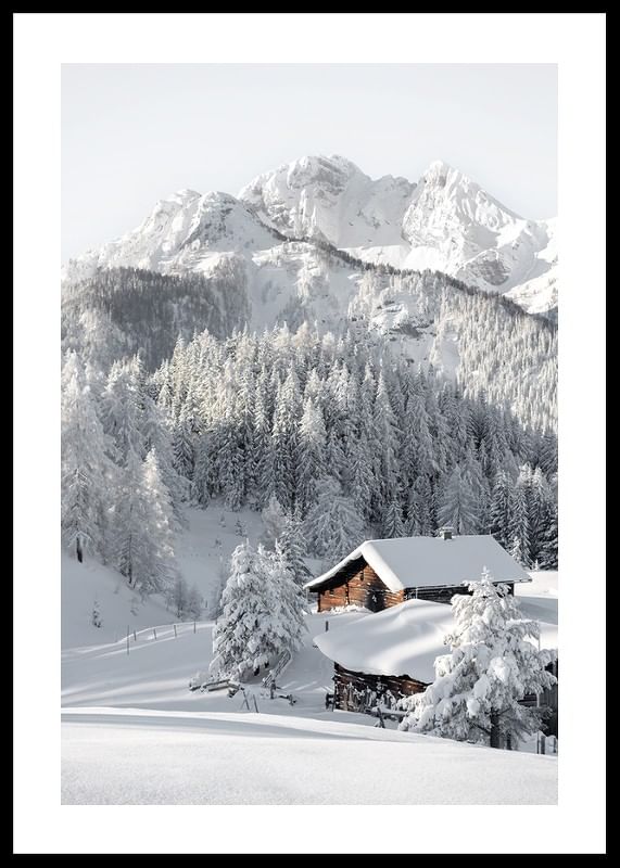 Este poster capta a essência de um dia calmo de inverno nas montanhas, onde uma encantadora cabana está rodeada de árvores carregadas de neve e majestosos picos de montanhas como pano de fundo. A imagem irradia calma e relaxamento, perfeita para criar um ambiente tranquilo em casa. Deixe que esta imagem seja um lembrete da beleza da natureza e da magia do inverno - um complemento perfeito para aqueles que desejam a quietude e a tranquilidade das montanhas.