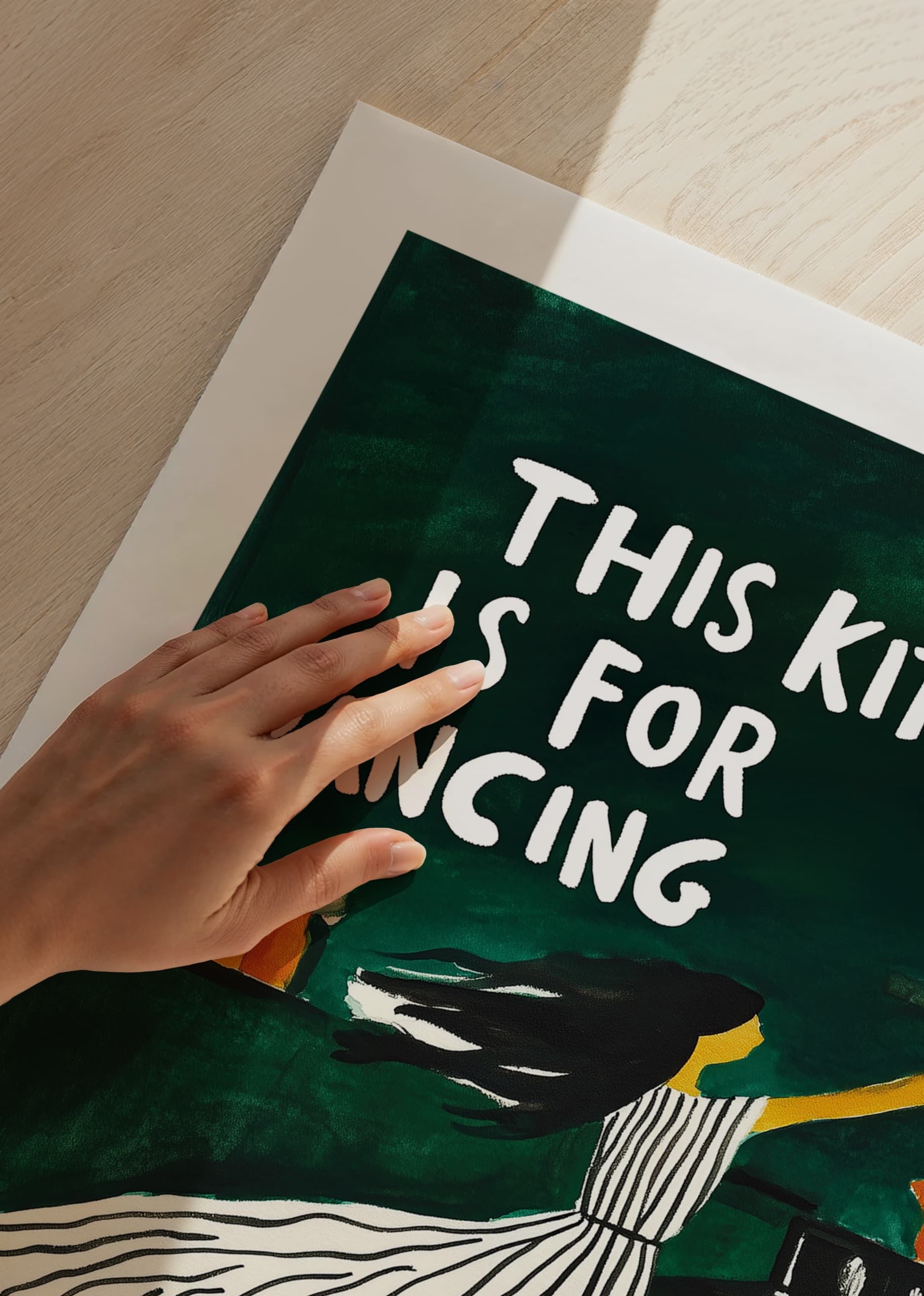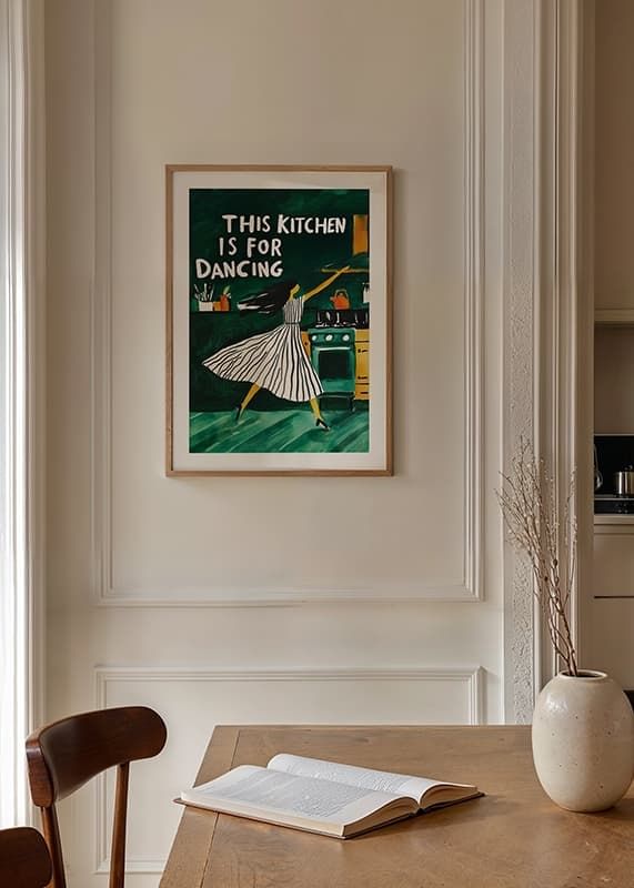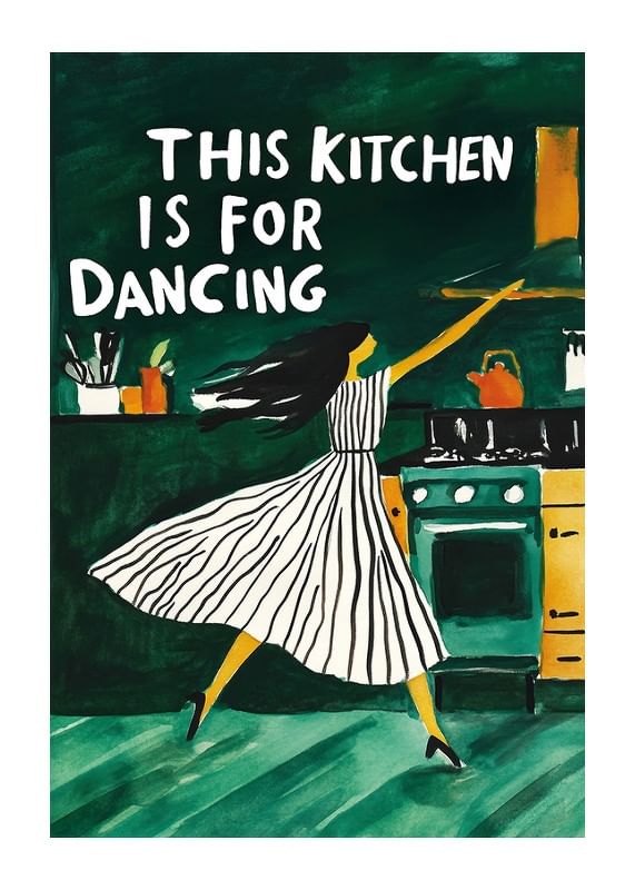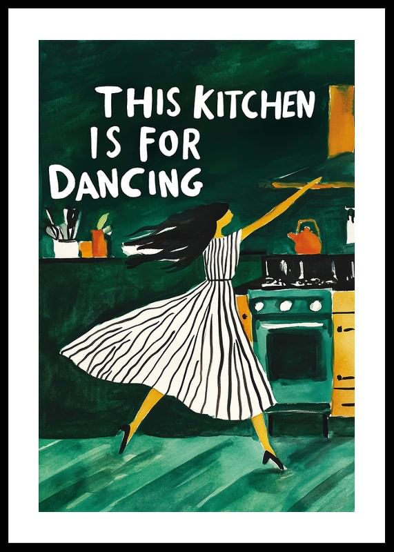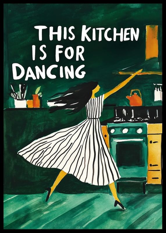Este divertido poster mostra uma mulher a dançar livremente na cozinha, com o texto "Esta cozinha é para dançar" como pano de fundo. Os tons de verde profundo e as pinceladas vibrantes criam uma atmosfera energética que transforma cada cozinha num lugar de alegria e movimento.
