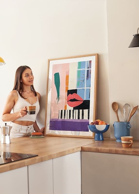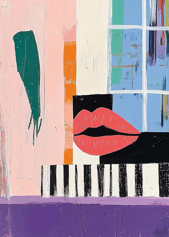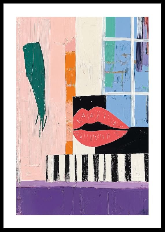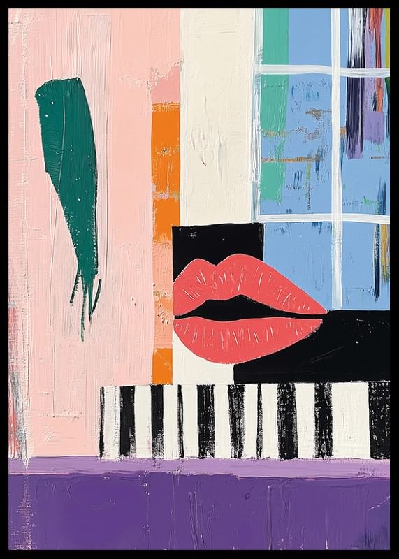 Descubra uma explosão de cores e formas neste póster artístico! Com uma mistura onírica de tons fortes, desde lábios rosa vibrantes a formas geométricas precisas, esta imagem capta um mundo imaginativo onde as teclas musicais se encontram com janelas de criatividade.