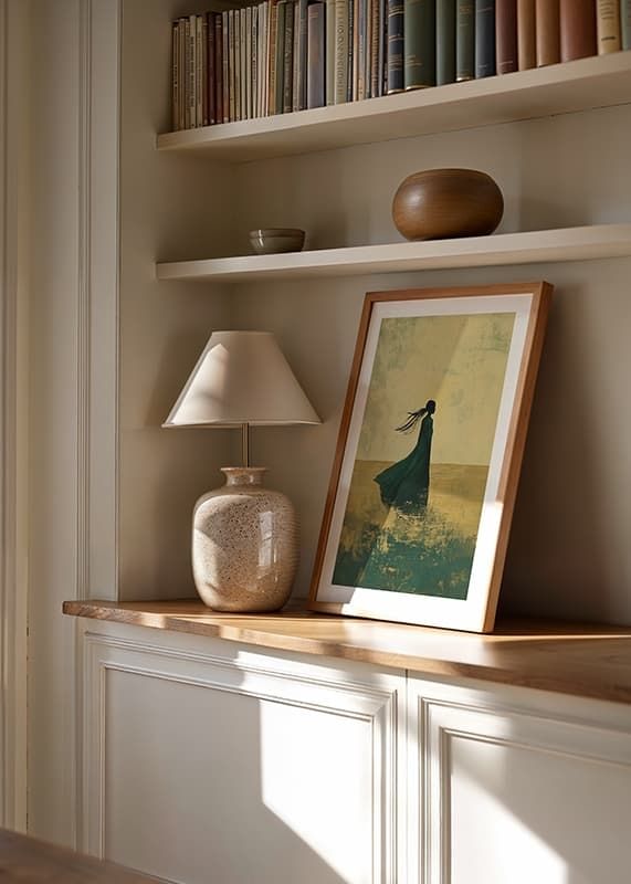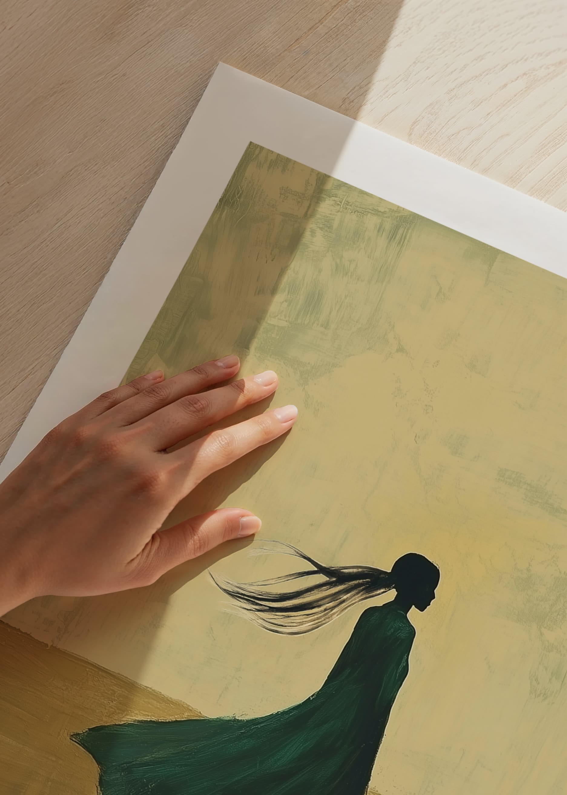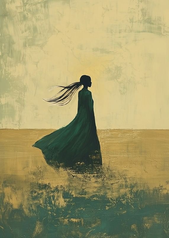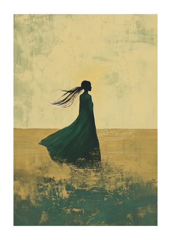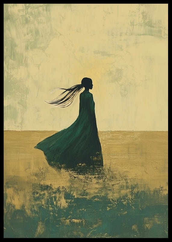 Descubra um mundo de mistério silencioso com este cartaz fascinante. Uma figura solitária, envolta num elegante vestido verde, surge contra um cenário onírico de tons suaves e terra. Esta imagem capta a essência da solidão e da introspeção com uma irresistível sensação de liberdade.