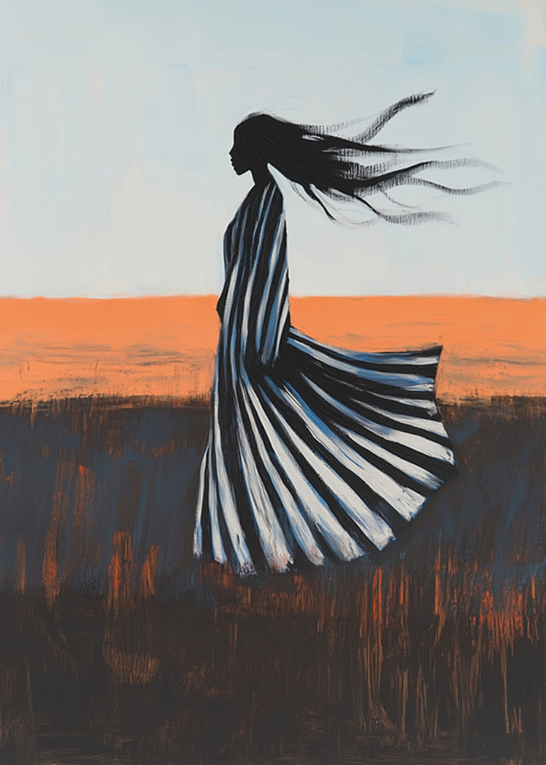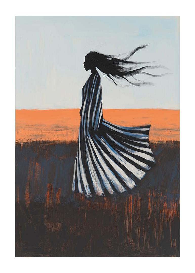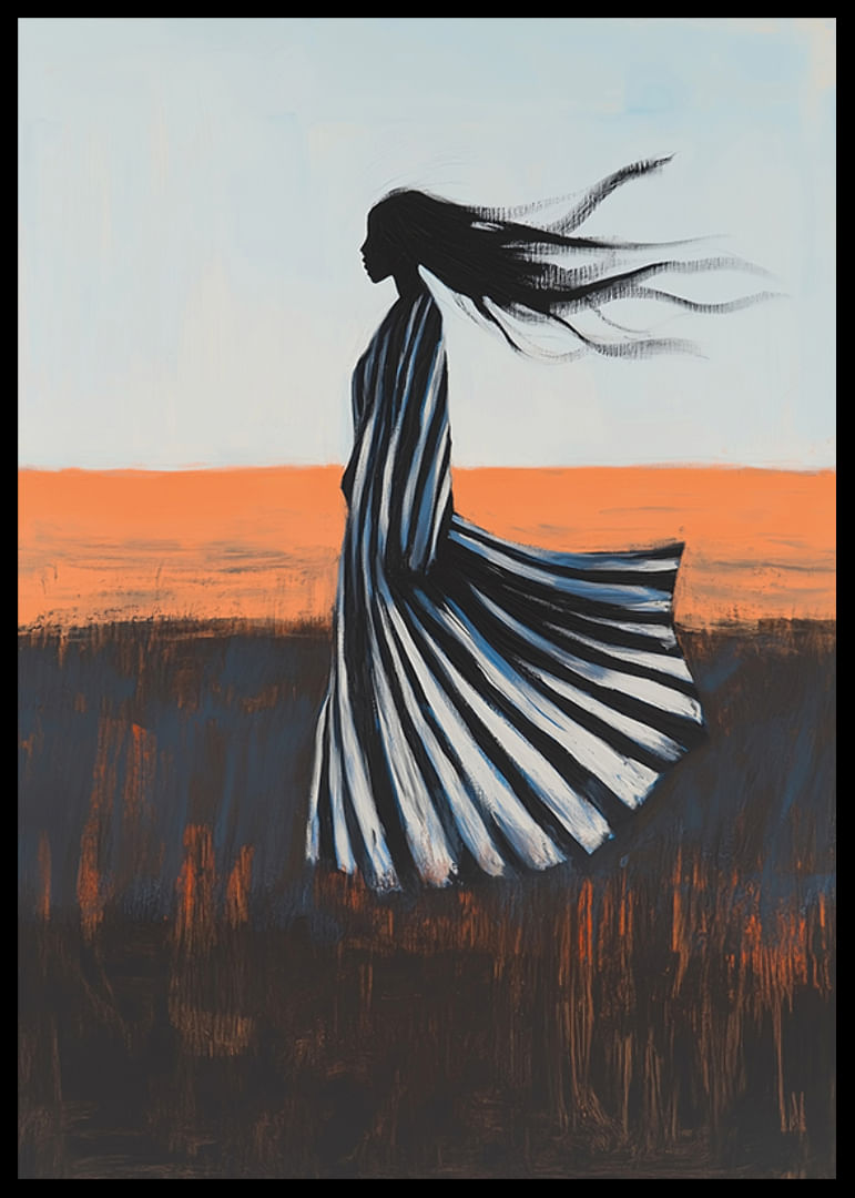 Experimente o poder da liberdade e do movimento com este cartaz cativante. Uma silhueta elegante é arrastada para uma paisagem em mudança, onde os tons brilhantes do céu se encontram com os matizes mais profundos da terra. O seu vestido balança dramaticamente ao sabor do vento, um símbolo de força e liberdade.