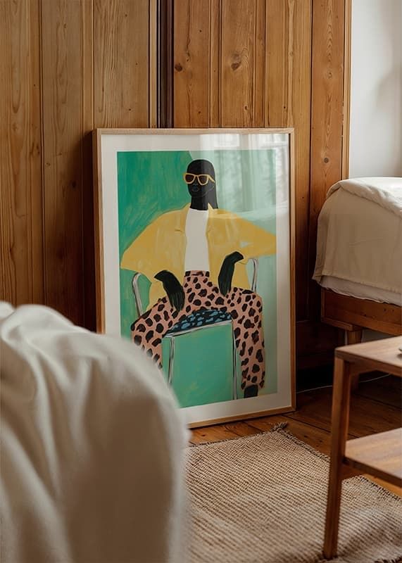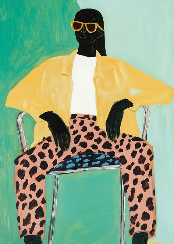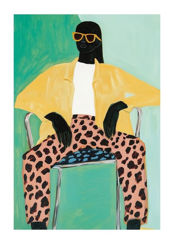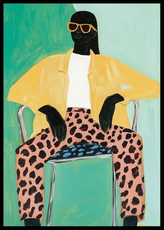 Explore a essência da confiança com este poster apelativo! Com cores fortes e um estilo moderno, capta um indivíduo elegante sentado em calma majestade. As calças com padrão leopardo e a camisa amarela sobre um fundo verde saturado criam um contraste dramático que dá vida ao ambiente.