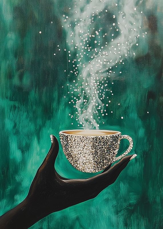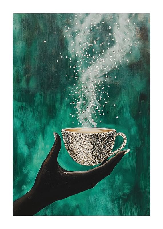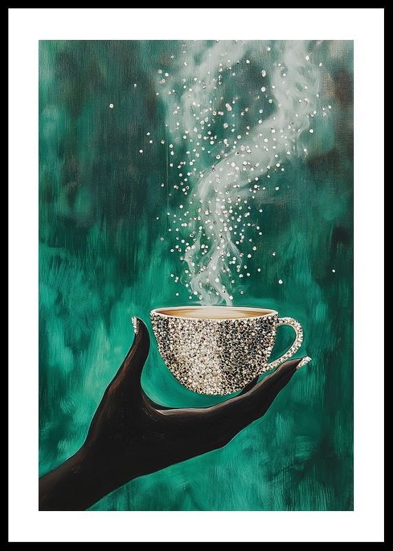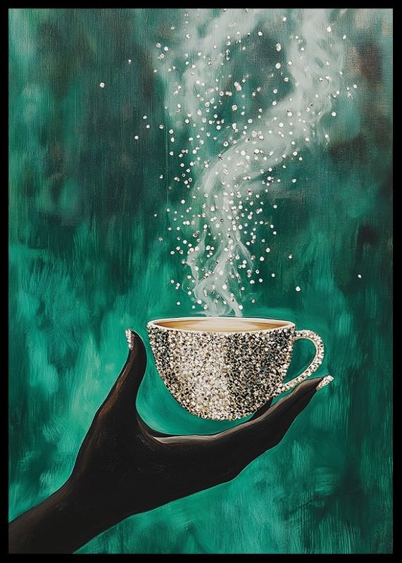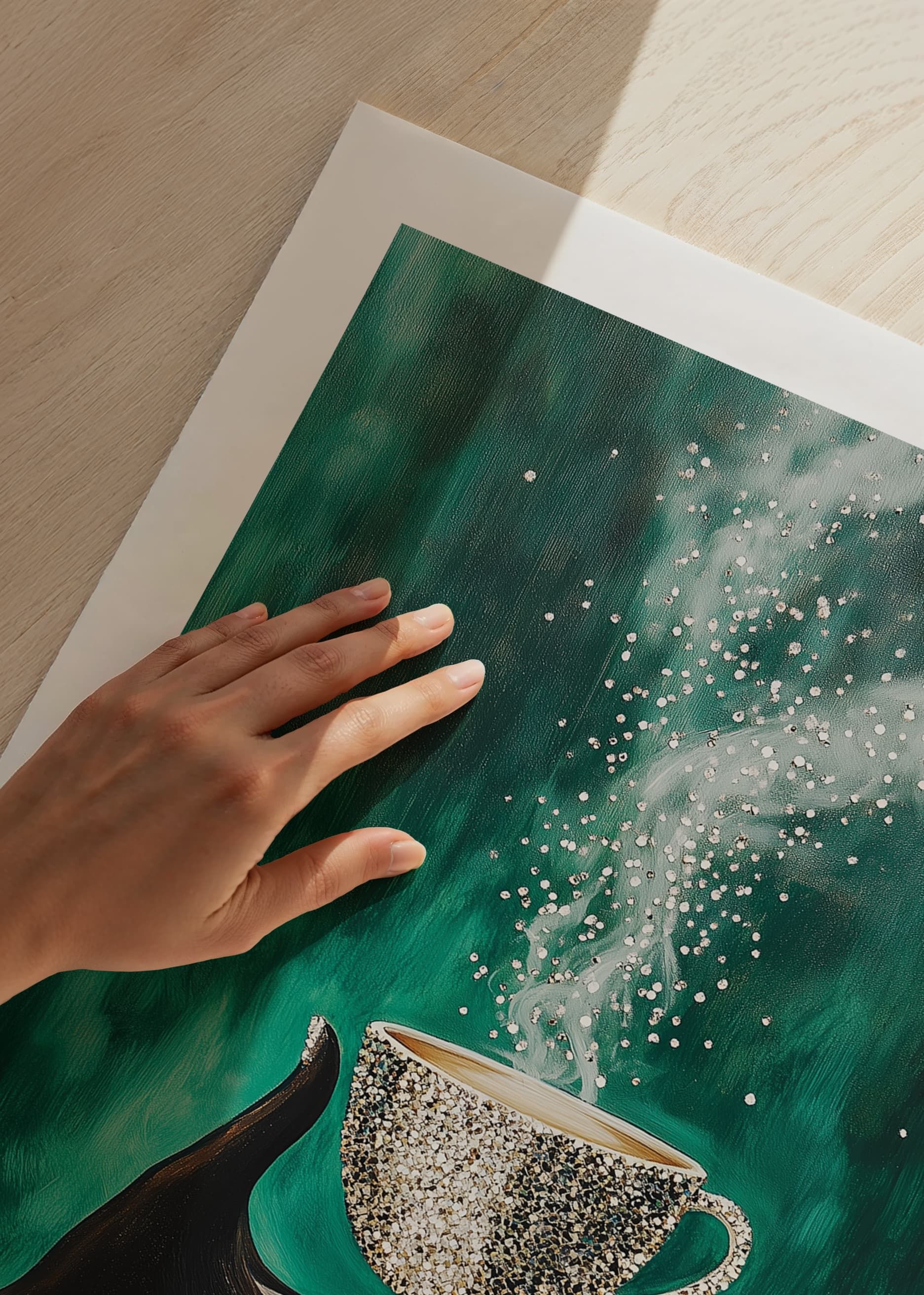 Descubra a magia do momento com este cartaz cativante. Uma mão elegante segura uma chávena brilhante cheia de energia fumegante e vivificante. Contra o fundo verde-esmeralda profundo, a luz e o movimento dançam, criando uma sensação de mistério e tranquilidade.