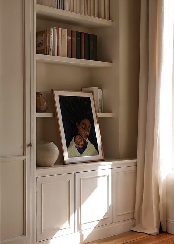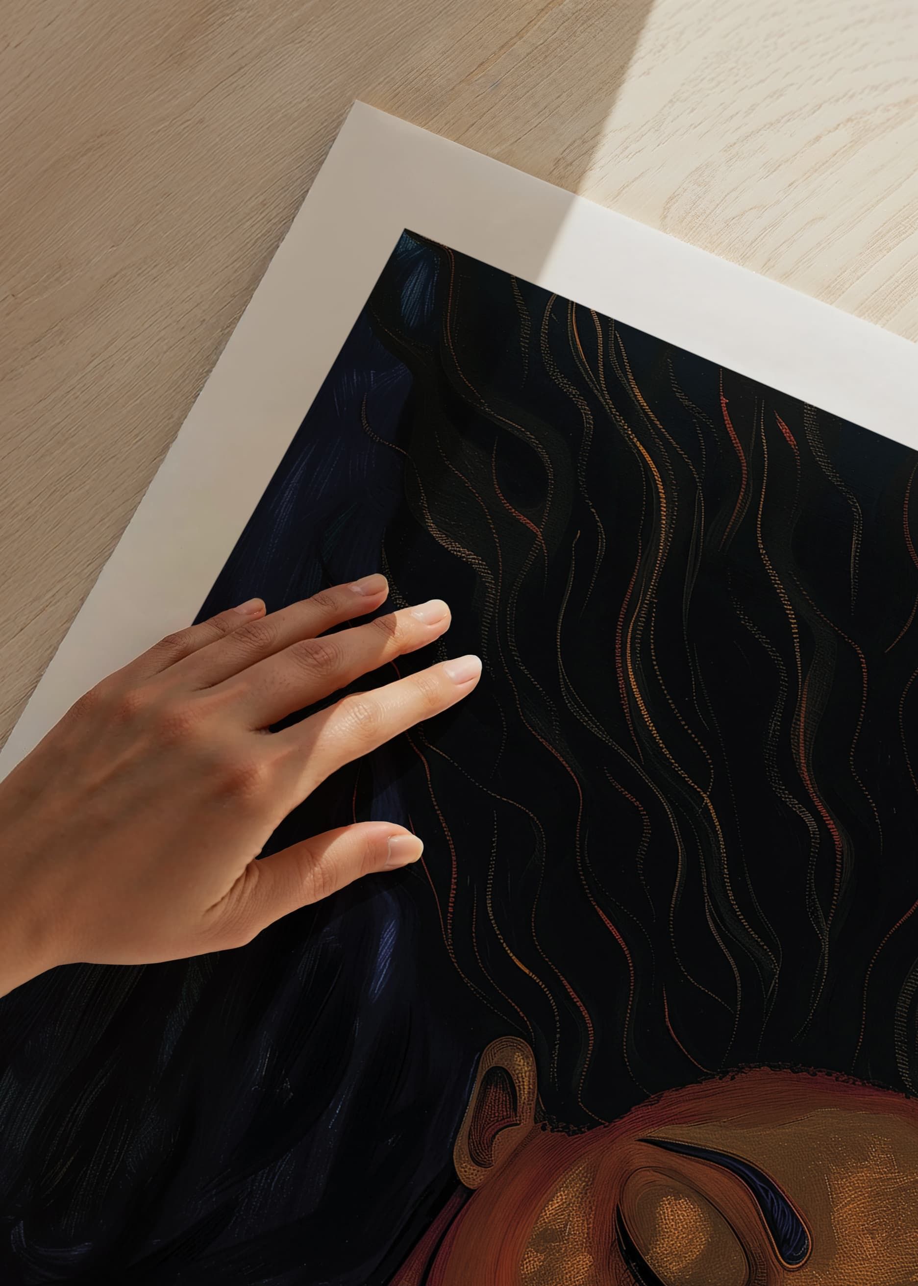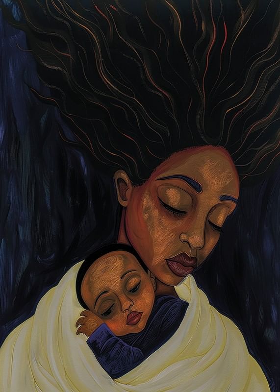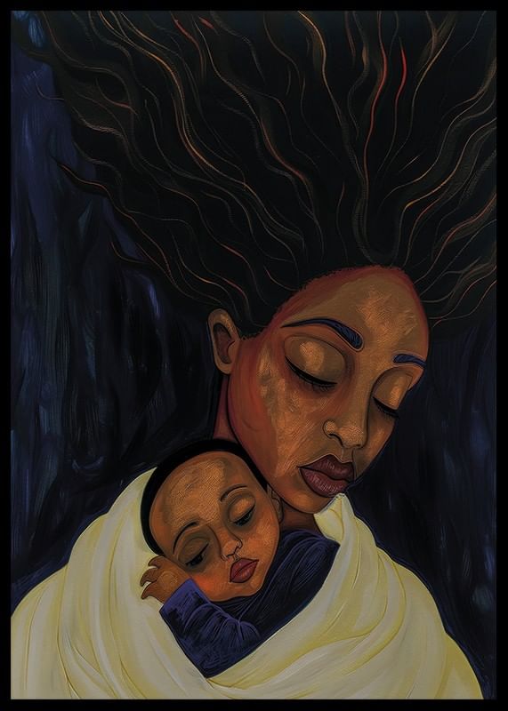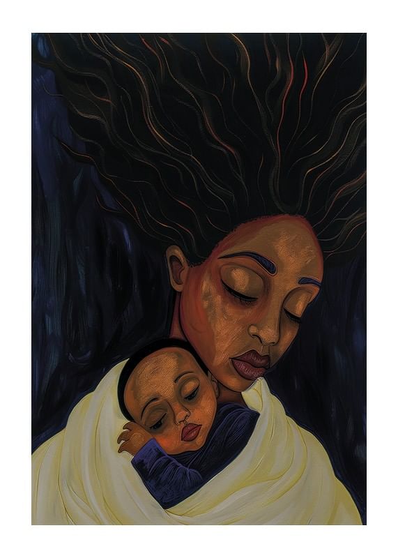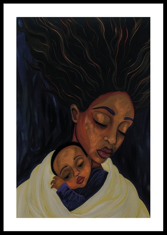 Este cartaz capta um momento profundamente comovente entre uma mãe e o seu filho adormecido. Os seus olhos estão fechados num descanso suave enquanto a criança descansa em segurança nos seus braços. Os tons escuros e suaves em contraste com a claridade quente evocam uma sensação de calma e proximidade.